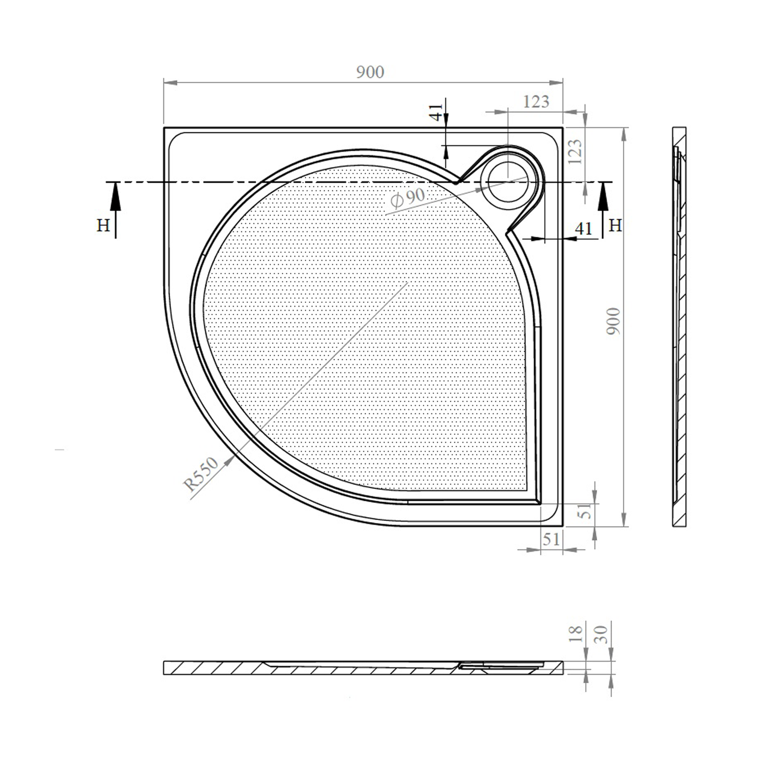 ARCA sprchová vanička z litého mramoru, čtvrtkruh 90x90cm, R550, bílá