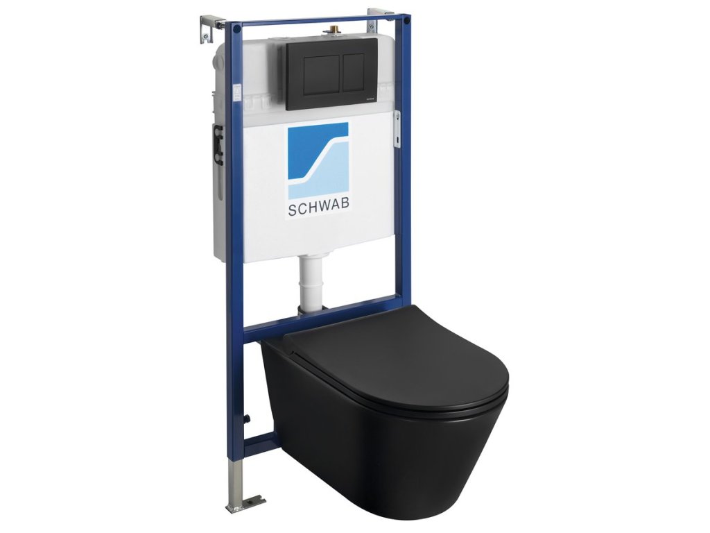 AVVA závěsné WC Rimless s podomítkovou nádržkou a tlačítkem Schwab, černá mat