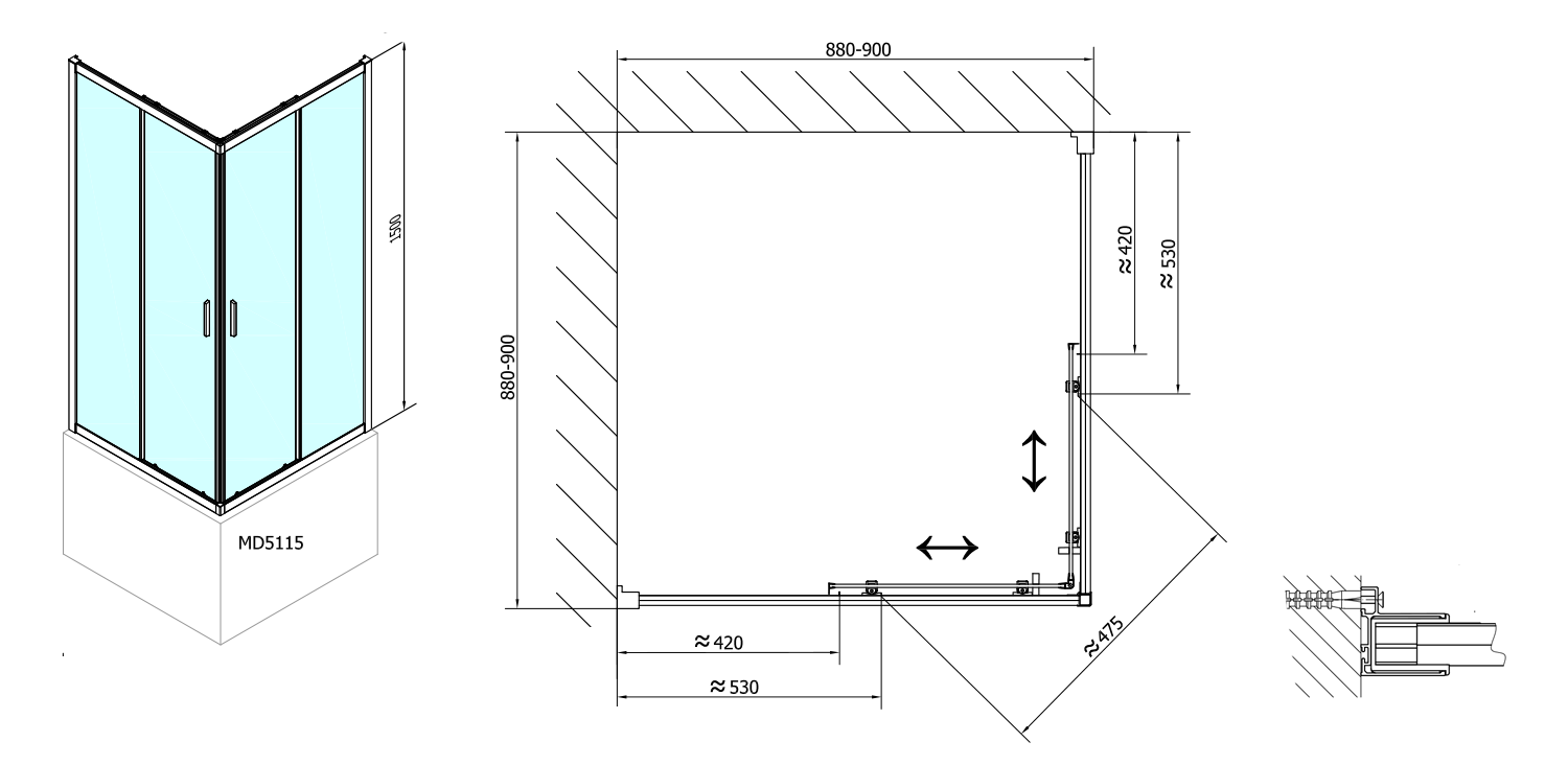 - Čtvercová zástěna s dvoudílnými posuvnými dveřmi