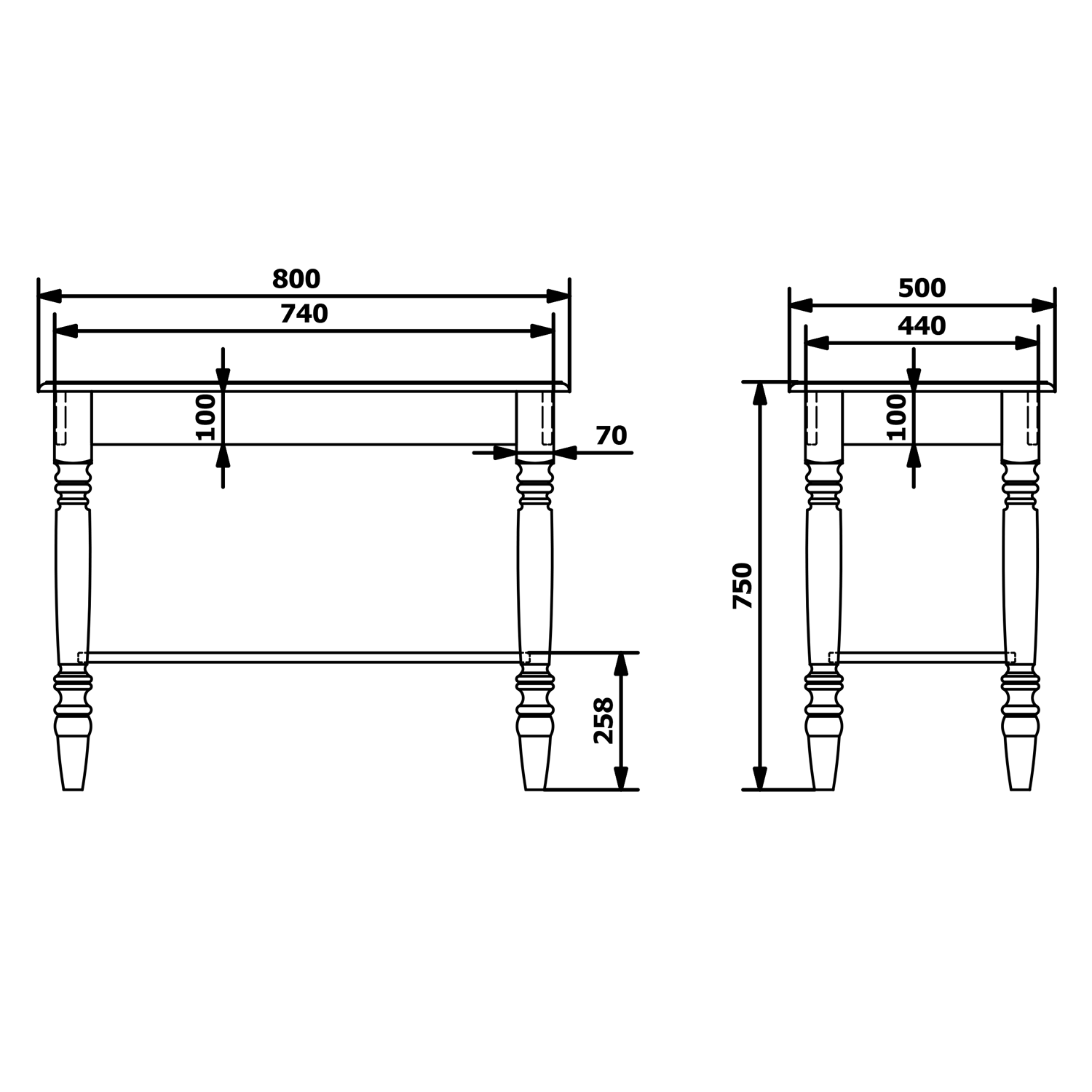 Stolek je vhodný pro umyvadla na postavení, absence šuplíku umožňuje libovolné umístění umyvadla i baterie v prostoru desky. Navíc je doplněn o praktickou spodní polici. V nabídce v šíři 80 a 100 cm a barevném provedení starobílá a mořený smrk.