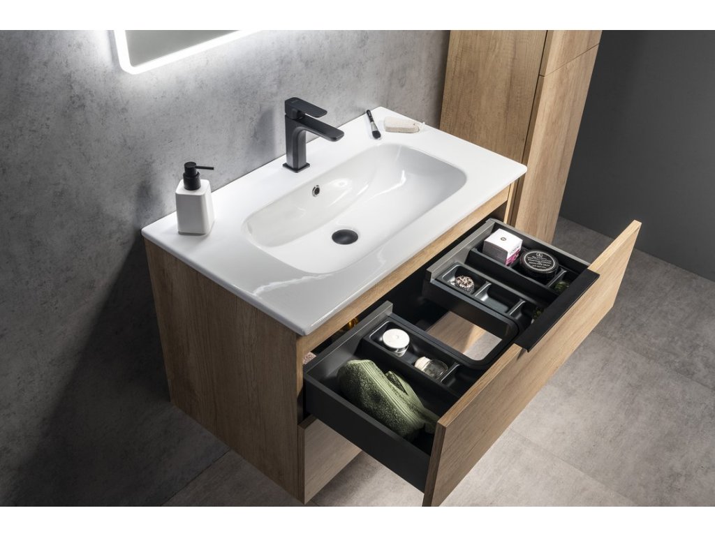 Velkou výhodou je možnost objednání praktických organizérů a misek LINDO pro uložení předmětů každodenní potřeby do horní i spodní zásuvky. Zásuvky jsou vybaveny výsuvy s pomalým dojezdem a automatickým dovřením, dvířka mají kování s tlumeným dovíráním. Úložný prostor lze rozšířit přidáním doplňkových skříněk ESPACE.