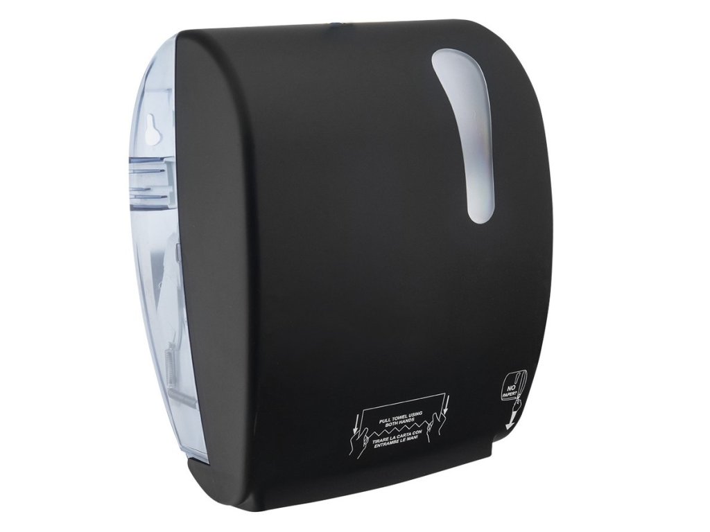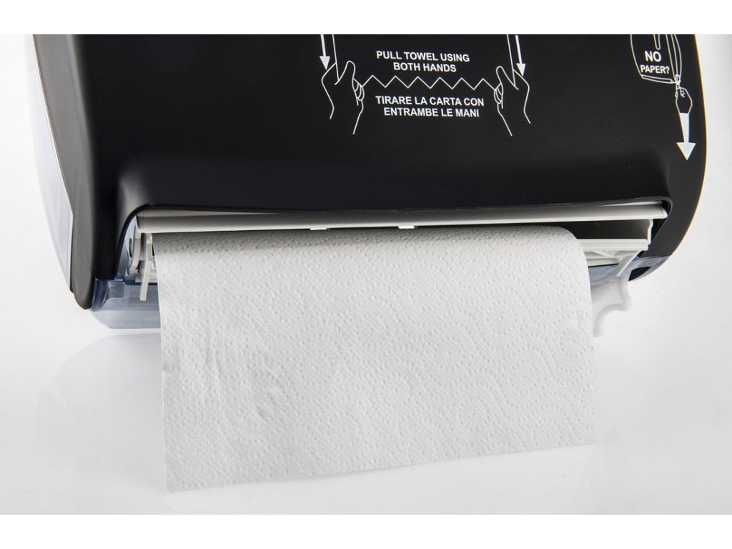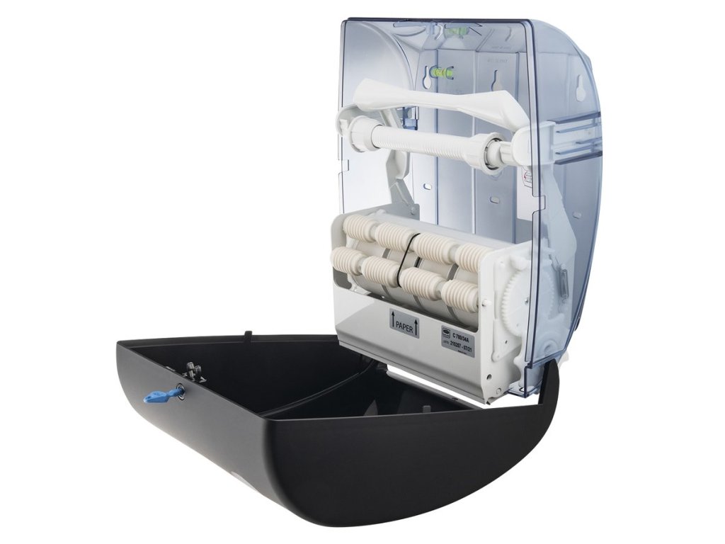 Plastový zásobník na papírové ručníky v roli s automatickým ořezem. Výkonný řezací mechanismus umožňuje plynulé dávkování po jednom útržku. Velká kapacita snižuje nutnost častého doplňování. Ideální pro rušné toalety např. ve školách, továrnách nebo na letištích. Polotransparentní okénko poskytuje dobrý přehled, kdy je třeba obsah doplnit.