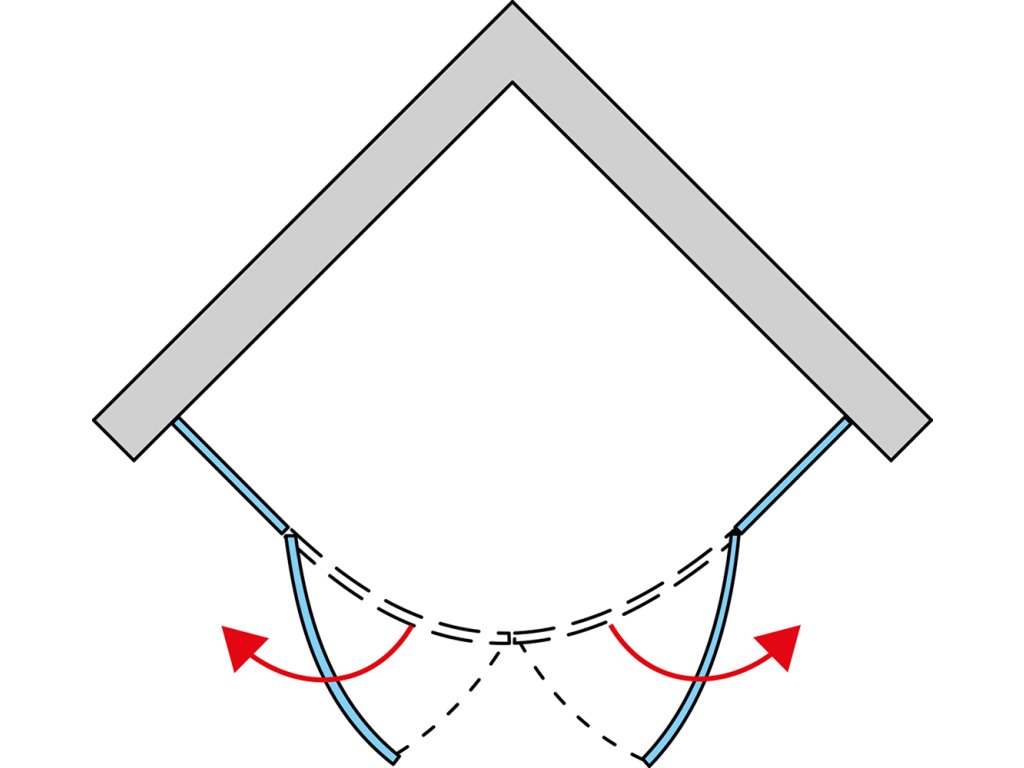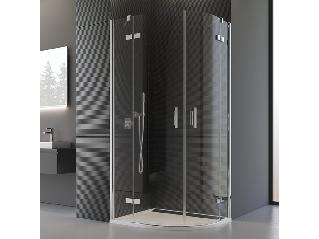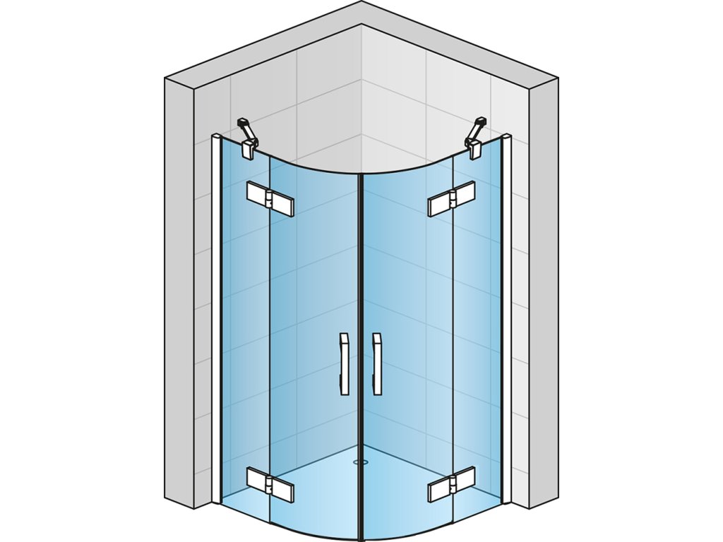 Sprchový kout od společnosti RONAL splňuje vysoké nároky na design a individuální řešení koupelny. Kvalitní chromované panty (na vnitřní straně zapuštěné), sprchové dveře z 6mm bezpečnostního skla a pevné díly z 8mm bezpečnostního skla, designová madla. Magnetické těsnění, chromované vyrovnávací profily, 5mm aluchromová prahová lišta pro lepší těsnost. Včetně dvou rohových vzpěr 300 mm. Antiplaková úprava skla AQUAPERLE pro snadné čištění. Sprchové dveře se otevírají ven. Napojení na zeď je řešeno vyrovnávacími profily. Rádius 550 mm.Doplňkové parametry