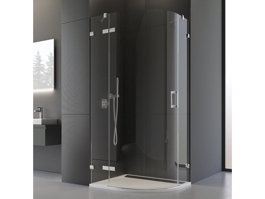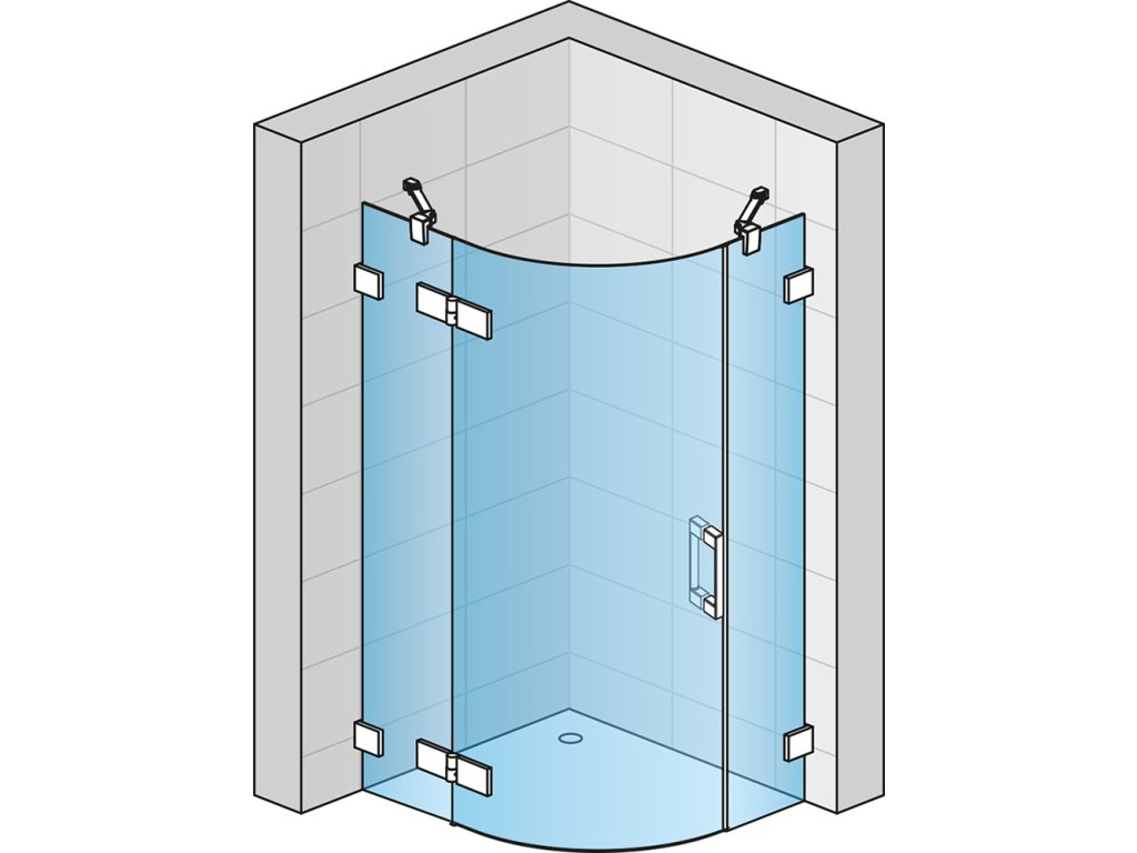 Sprchový kout od společnosti RONAL splňuje vysoké nároky na design a individuální řešení koupelny. Kvalitní materiály jako masivní chromované panty (na vnitřní straně zapuštěné) a kování, sprchové dveře z 6mm bezpečnostního skla a pevné díly z 8mm bezpečnostního skla, designové madlo. Magnetické těsnění, těsnicí U-profil 50552, 5mm aluchromová prahová lišta. Včetně dvou rohových vzpěr 300 mm. Antiplaková úprava skla AQUAPERLE pro snadné čištění. Sprchové dveře se otevírají ven. Napojení na zeď je řešeno L-kováním. Rádius 600 mm.Doplňkové parametry