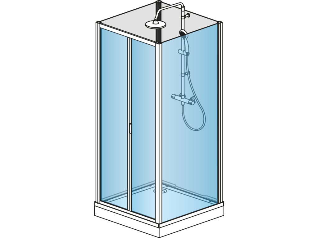 Inovativní a nadčasová sprchová kabina MODUL1200 od RONAL se čtvercovou vaničkou 900x900 mm, se 2 zadními stěnami z bezpečnostního lakovaného skla s antiplakovou úpravou Aquaperle, se zalamovacími dveřmi z řady ARELIA D20K a boční stěnou v 90° D20FM. Varianta baterie 4 – termostatická baterie s ruční a hlavovou sprchou. Čiré sklo. Jedná se o řešení do niky.Doplňkové parametry