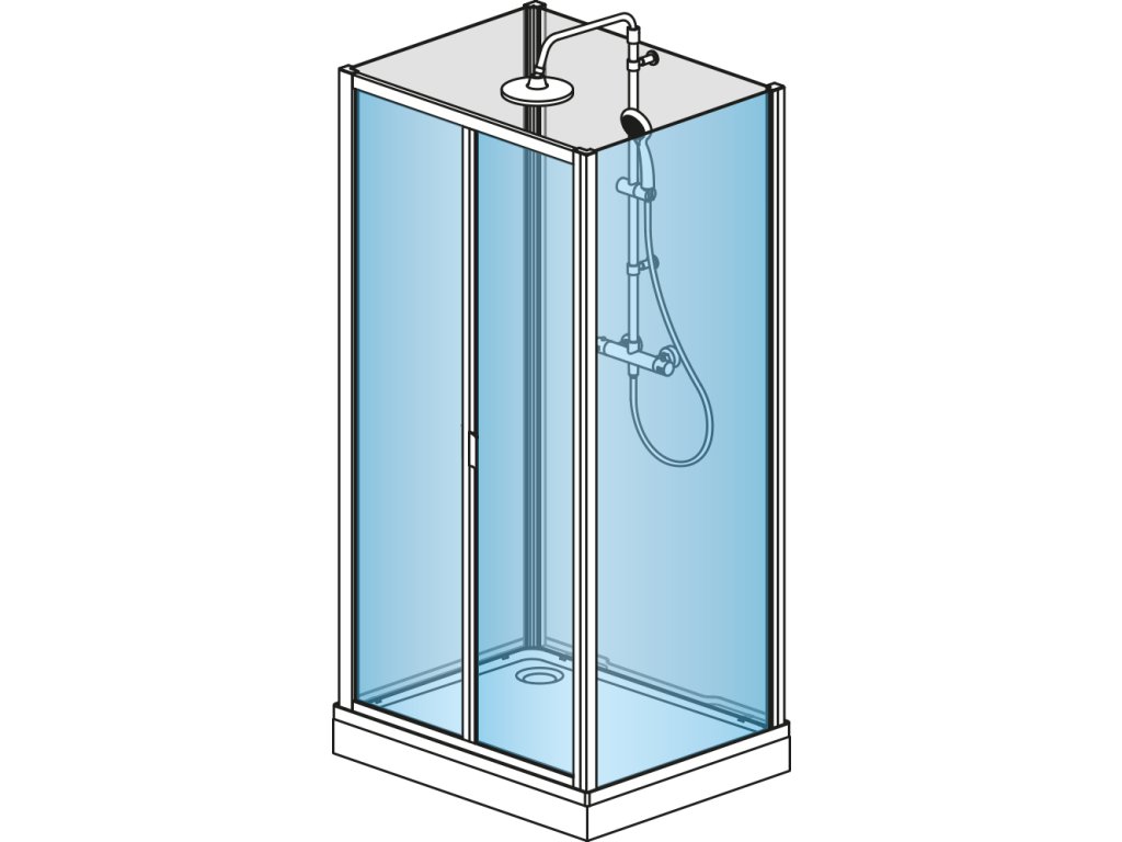 Inovativní a nadčasová sprchová kabina MODUL1200 od RONAL s obdélníkovou sprchovou vaničkou o rozměrech 800x1000 mm, se 2 zadními stěnami z bezpečnostního lakovaného skla s antiplakovou úpravou Aquaperle, se zalamovacími dveřmi z řady ARELIA D20K a boční stěnou v 90° D20FM. Varianta baterie 4 – termostatická baterie s ruční a hlavovou sprchou. Čiré sklo. Jedná se o řešení do niky.Doplňkové parametry