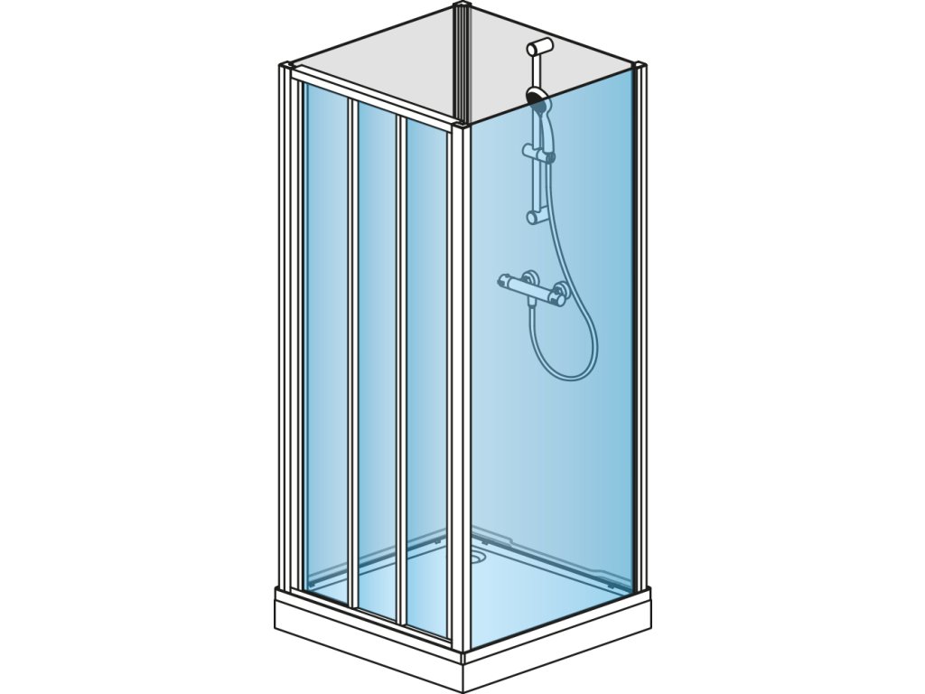 Inovativní a nadčasová sprchová kabina MODUL1200 od RONAL se čtvercovou vaničkou 900x900 mm, se 2 zadními stěnami z bezpečnostního lakovaného skla s antiplakovou úpravou Aquaperle, s třídílnými posuvnými dveřmi řady ARELIA D20S3 a boční stěnou v 90° D20FM. Varianta baterie 3 – termostatická baterie s ruční sprchou. Čiré sklo. Jedná se o řešení do rohu.Doplňkové parametry