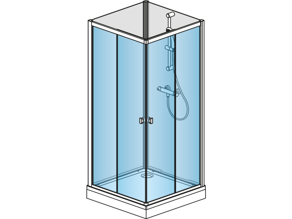 Inovativní a nadčasová sprchová kabina MODUL1200 od RONAL se čtvercovou vaničkou 900x900 mm, se 2 zadními stěnami z bezpečnostního lakovaného skla s antiplakovou úpravou Aquaperle, jedná se o rohový vstup s dvoudílnými posuvnými dveřmi řady ARELIA D20SE2. Varianta baterie 3 – termostatická baterie s ruční sprchou. Čiré sklo. Jedná se o řešení do rohu.Doplňkové parametry