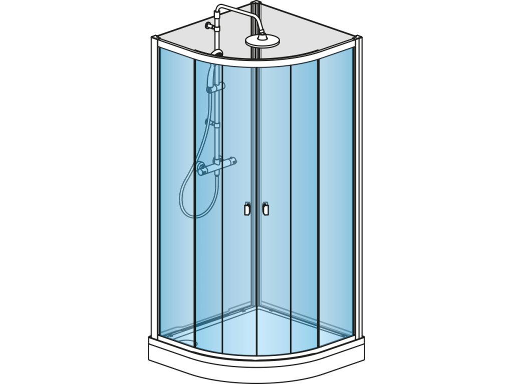Inovativní a nadčasová sprchová kabina MODUL1200 od RONAL se čtvrtkruhovou sprchovou vaničkou o rozměrech 900x900 mm, se 2 zadními stěnami z bezpečnostního lakovaného skla s antiplakovou úpravou Aquaperle, jedná se o čtvrtkruh s dvoudílnými posuvnými dveřmi z řady ARELIA D20SR. Varianta baterie 4 – termostatická baterie s ruční a hlavovou sprchou. Čiré sklo. Jedná se o řešení do rohu.Doplňkové parametry