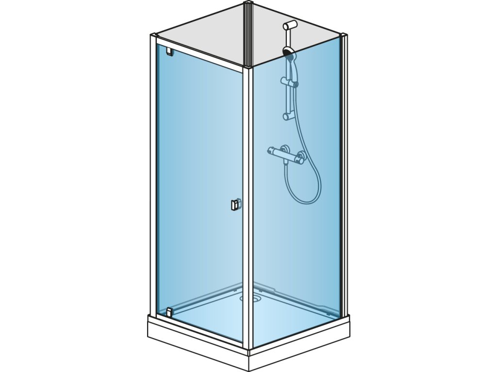 Inovativní a nadčasová sprchová kabina MODUL1200 od RONAL se čtvercovou vaničkou 800x800 mm, se 2 zadními stěnami z bezpečnostního lakovaného skla s antiplakovou úpravou Aquaperle, s jednokřídlými dveřmi řady ARELIA D20T1 a boční stěnou v 90° D20FM. Varianta baterie 3 – termostatická baterie s ruční sprchou. Čiré sklo. Jedná se o řešení do niky.Doplňkové parametry
