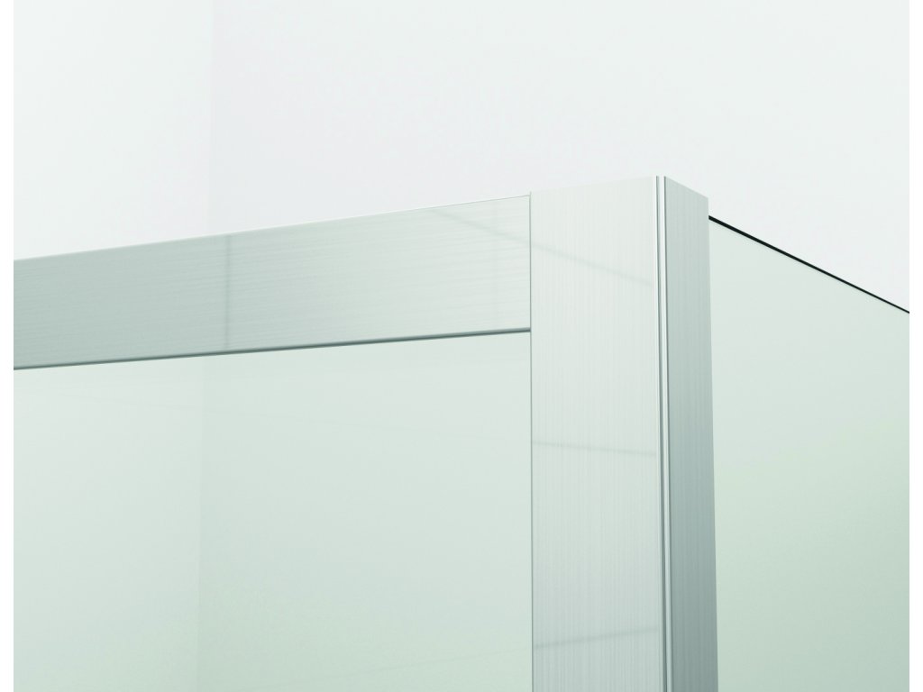 Inovativní a nadčasová sprchová kabina MODUL1200 od RONAL s obdélníkovou sprchovou vaničkou 800x1000 mm, se 2 zadními stěnami z bezpečnostního lakovaného skla s antiplakovou úpravou Aquaperle, s jednokřídlými dveřmi z řady ARELIA D20T1 a boční stěnou v 90° D20FM. Varianta baterie 3 – termostatická baterie s ruční sprchou. Čiré sklo. Jedná se o řešení do niky.Doplňkové parametry