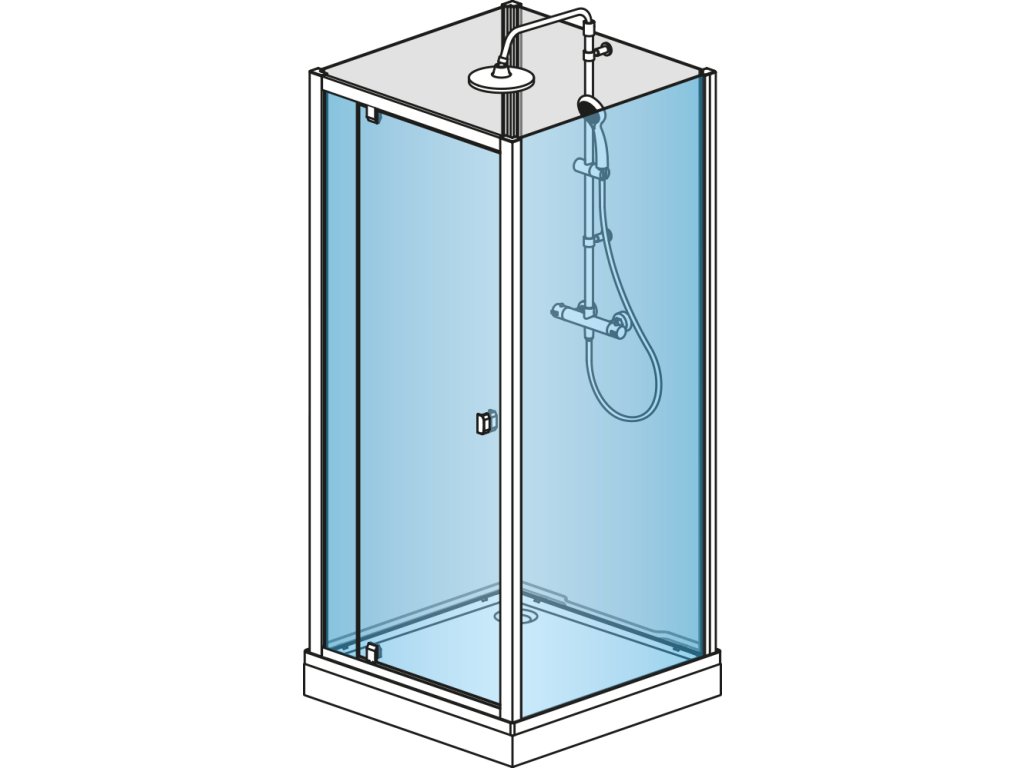 Inovativní a nadčasová sprchová kabina MODUL1200 od RONAL se čtvercovou vaničkou 900x900 mm, se 2 zadními stěnami z bezpečnostního lakovaného skla s antiplakovou úpravou Aquaperle, s jednokřídlými dveřmi s pevnou stěnou v rovině řady ARELIA D20T13 a boční stěnou v 90° D20FM. Varianta baterie 4 – termostatická baterie s ruční a hlavovou sprchou. Čiré sklo. Jedná se o řešení do niky.Doplňkové parametry