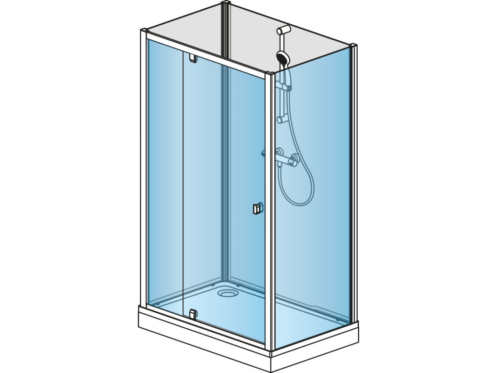 Inovativní a nadčasová sprchová kabina MODUL1200 od RONAL s obdélníkovou sprchovou vaničkou o rozměrech 800x1200 mm, se 2 zadními stěnami z bezpečnostního lakovaného skla s antiplakovou úpravou Aquaperle, s jednokřídlými dveřmi s pevnou stěnou v rovině z řady ARELIA D20T13 a boční stěnou v 90° D20FM. Varianta baterie 3 – termostatická baterie s ruční sprchou. Čiré sklo. Jedná se o řešení do niky.Doplňkové parametry