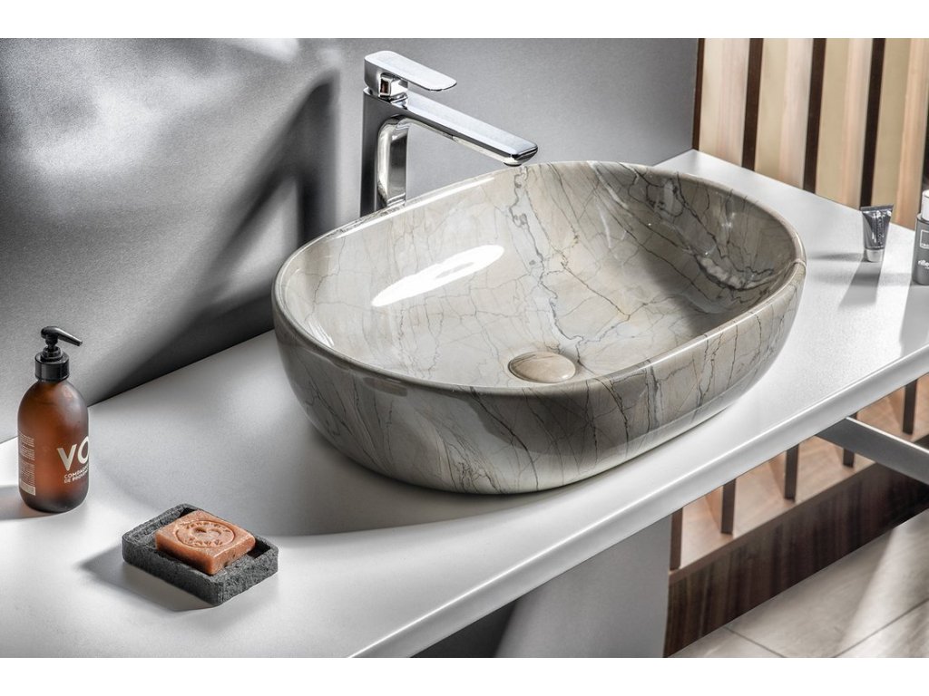 Série keramických umyvadel DALMA zaujme kamenným efektem. Umyvadla jsou glazovaná s vypálenými obtisky v designu kamene, čímž je zaručena stálost a trvanlivost dekoru. Vybírat můžete nejen ze tří dekorů v odstínech mramoru, ale i z pěti tvarů. Umyvadla jsou určena k postavení na desku, ke všem lze dokoupit uzavíratelnou výpust v barvě umyvadla.