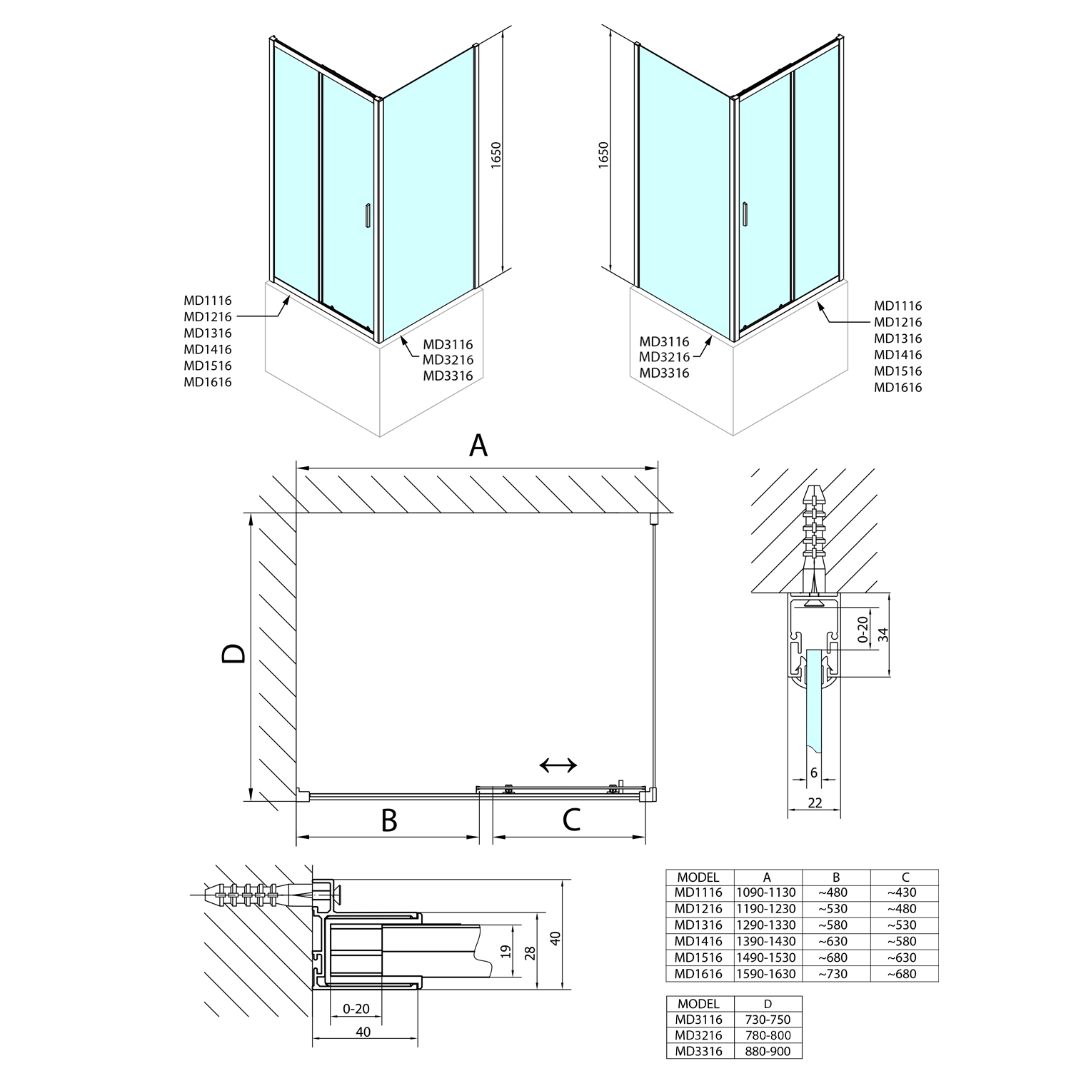 - Snadná montáž, tolerance 20 mm nastavením skel v profilu