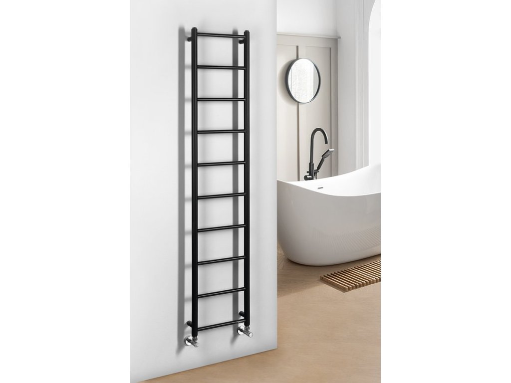 Elegantní koupelnový radiátor ze správně kombinovaných průměrů vodorovných a svislých trubek. Krása v jednoduchosti skloubená s atraktivním barevným provedením.