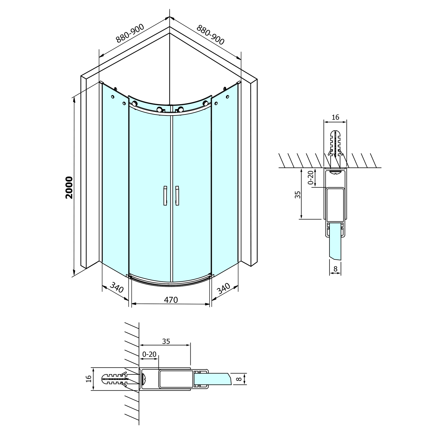 DRAGON čtvrtkruhová zástěna 900x900 mm, sklo čiré