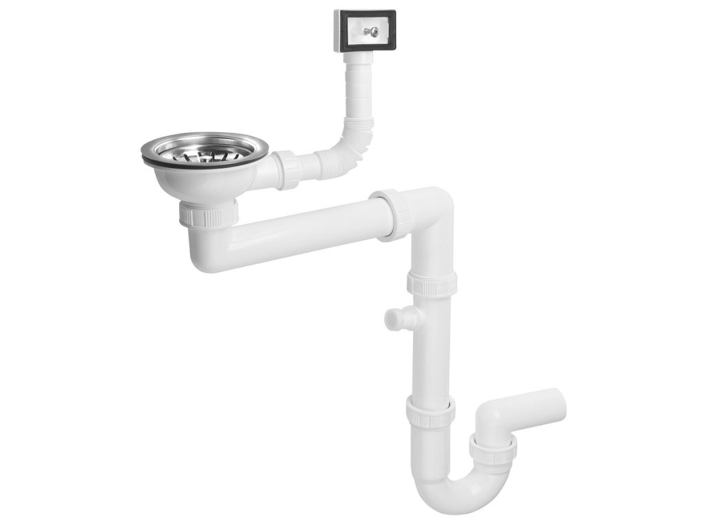 Dřezový sifon šetřící místo s přepadem a odbočkou 6/4", včetně pilety, DN40, bílá