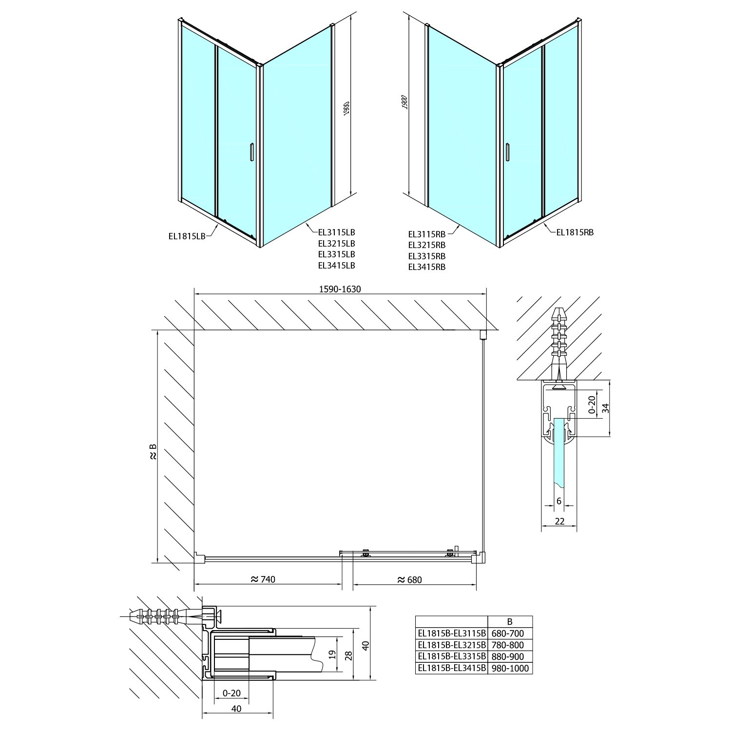 - Instalační rozměr dveří do niky lze díky rozšiřovacímu profilu EL825 zvětšit o 25 mm na každou stranu, celkem o 50 mm
