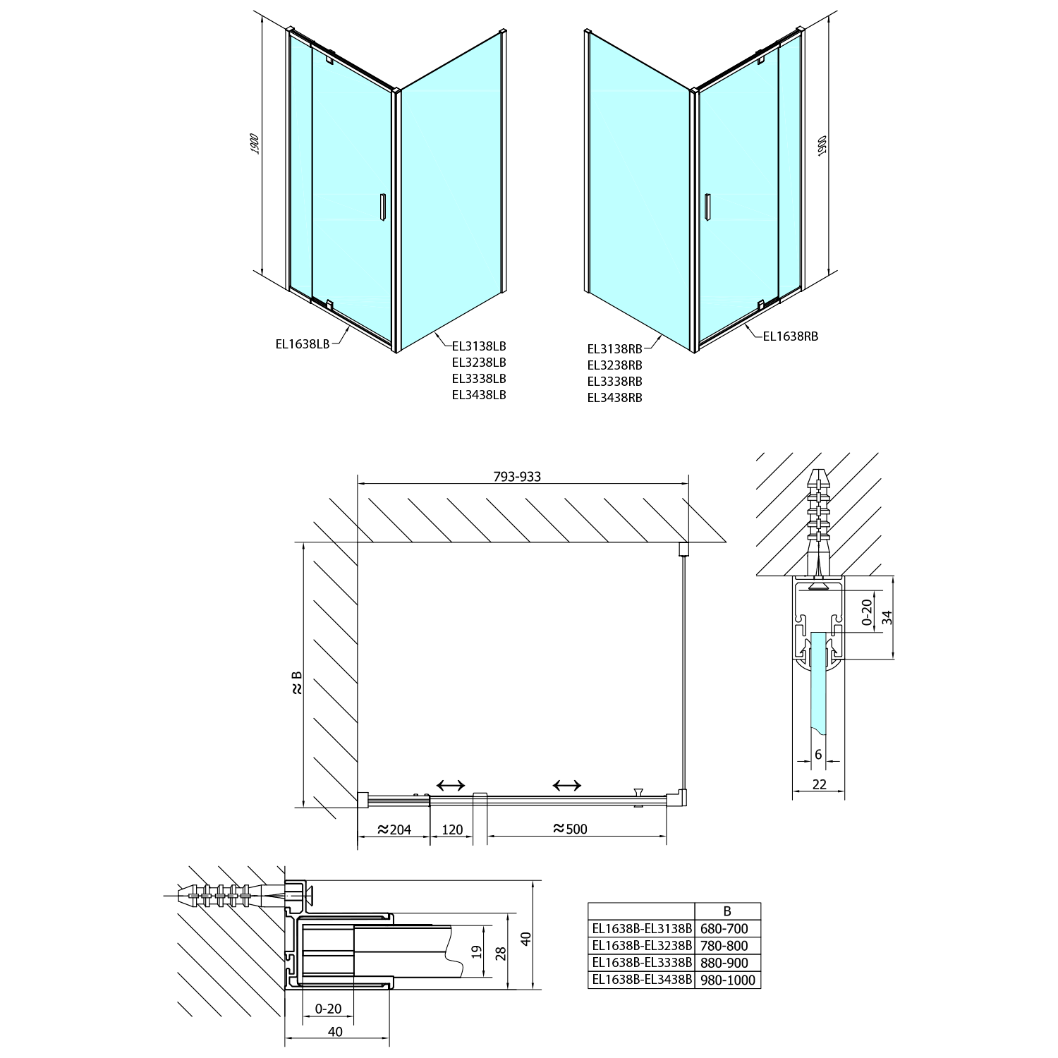 - Instalační rozměr dveří do niky lze díky rozšiřovacímu profilu EL825 zvětšit o 25 mm na každou stranu, celkem o 50 mm