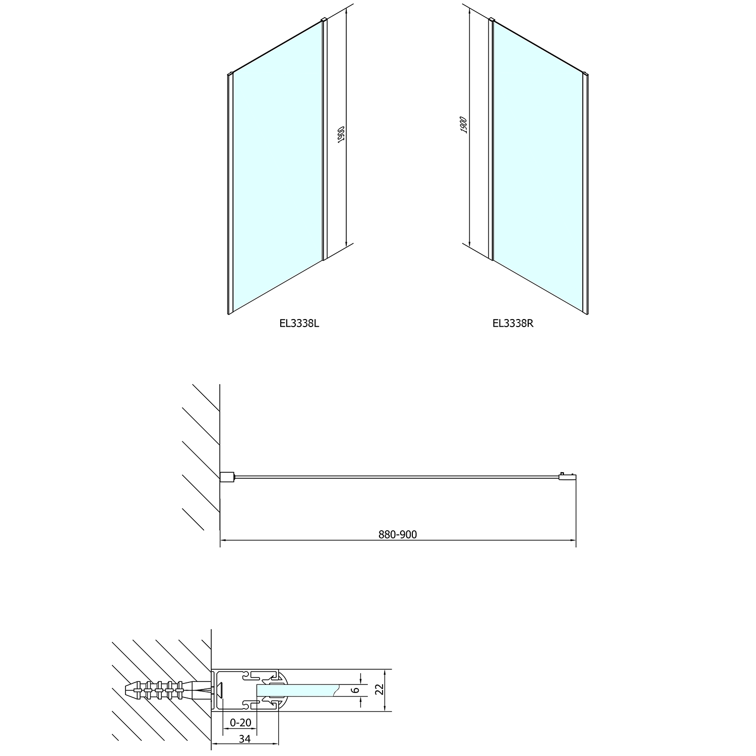 EASY boční stěna 900mm, sklo Brick