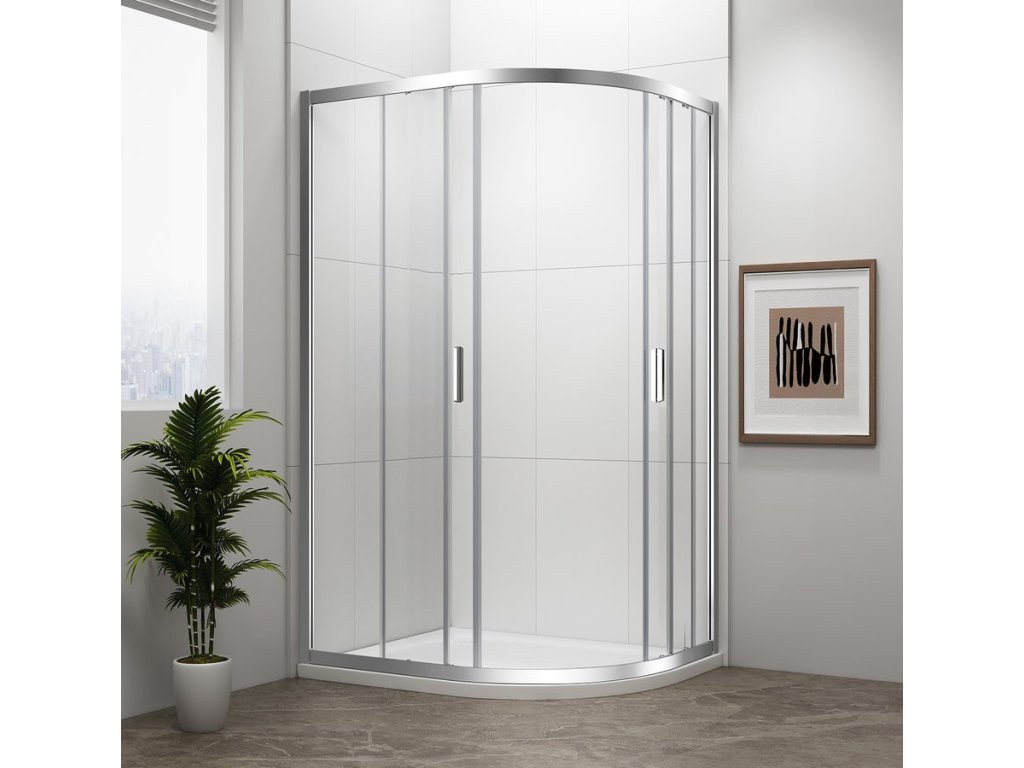 - Čtvrtkruhové zástěny s dvoudílnými posuvnými obloukovými dveřmi, rohový vstup