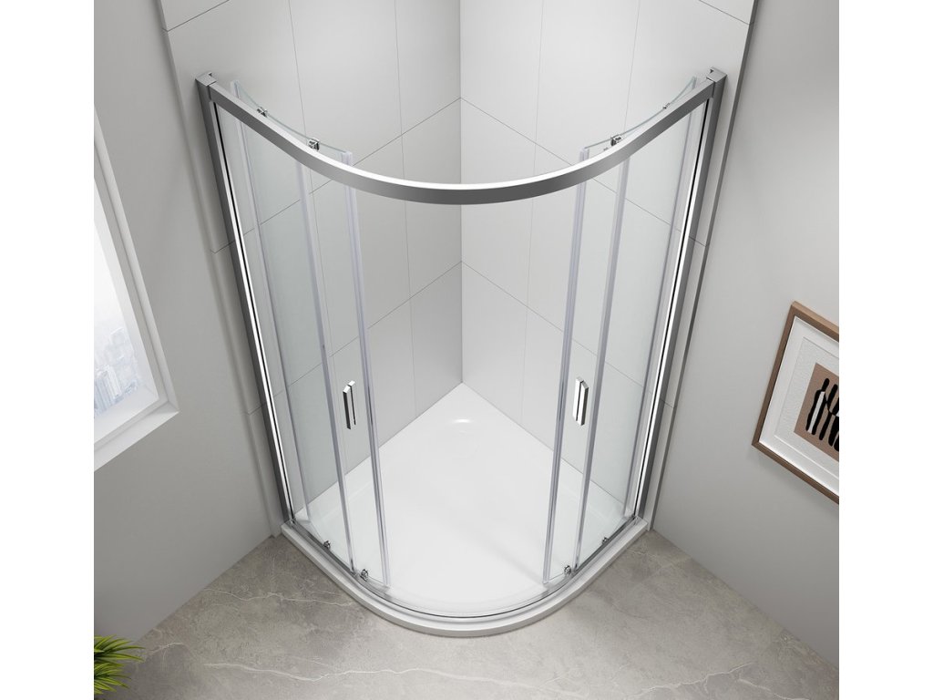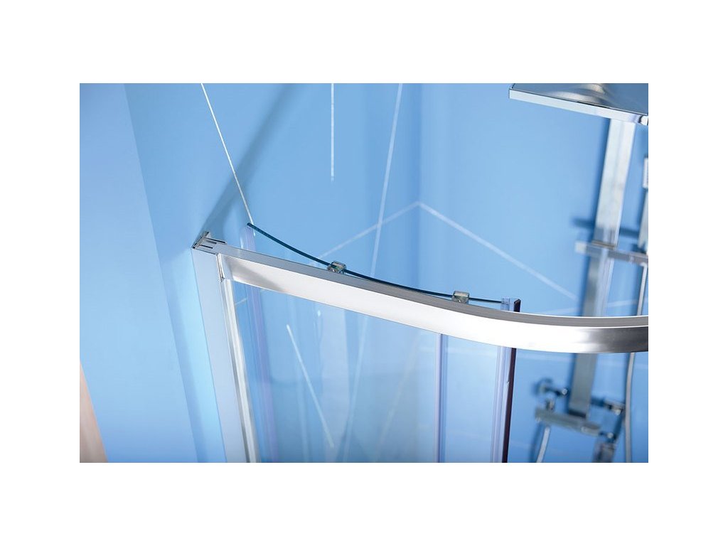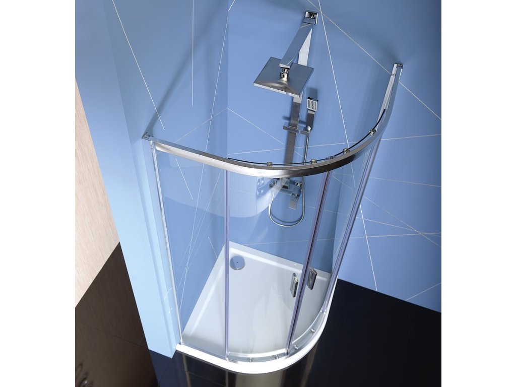 - Čtvrtkruhové zástěny s dvoudílnými posuvnými obloukovými dveřmi, rohový vstup