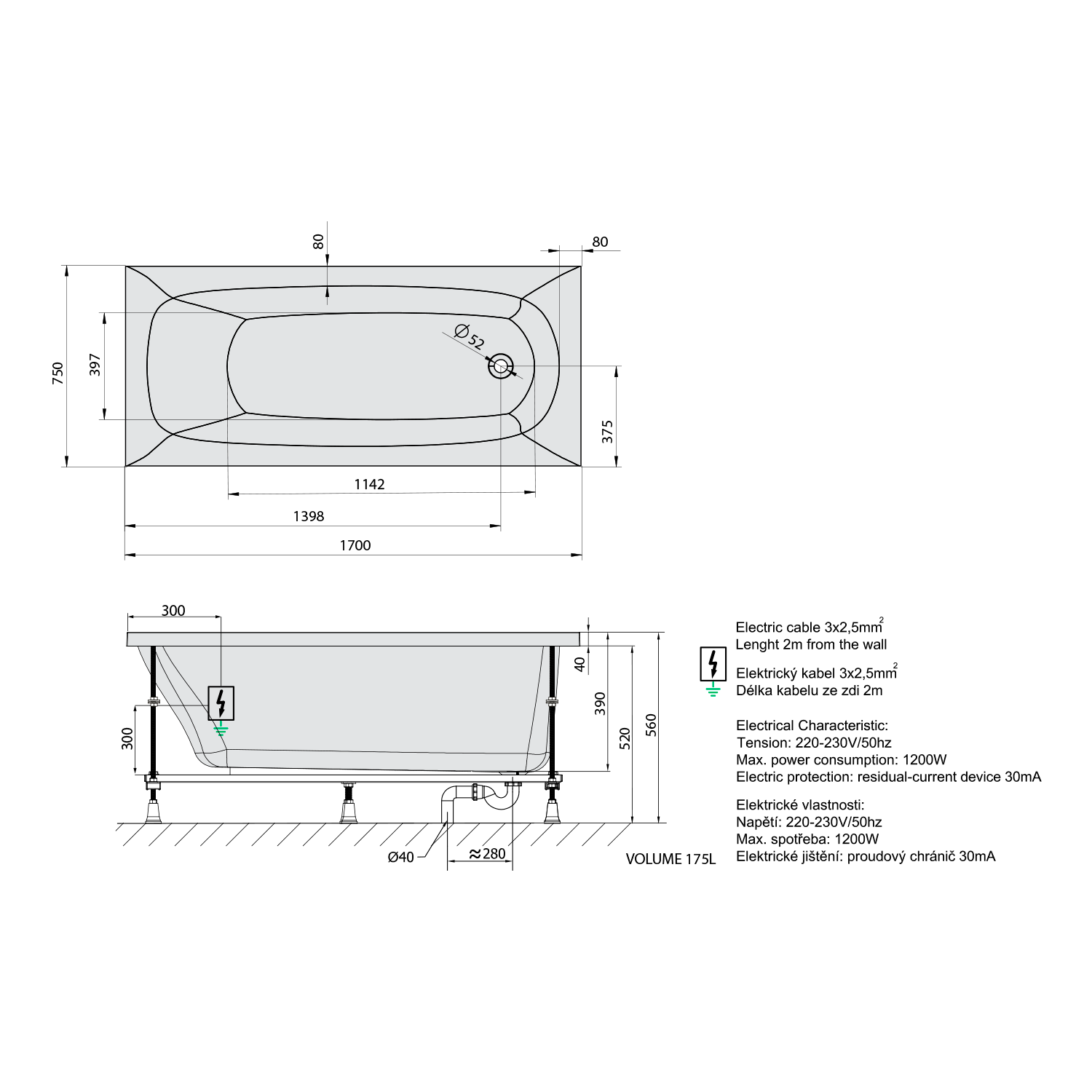 EBRO hydromasážní vana, 170x75x39cm, Highline Hydro, chrom