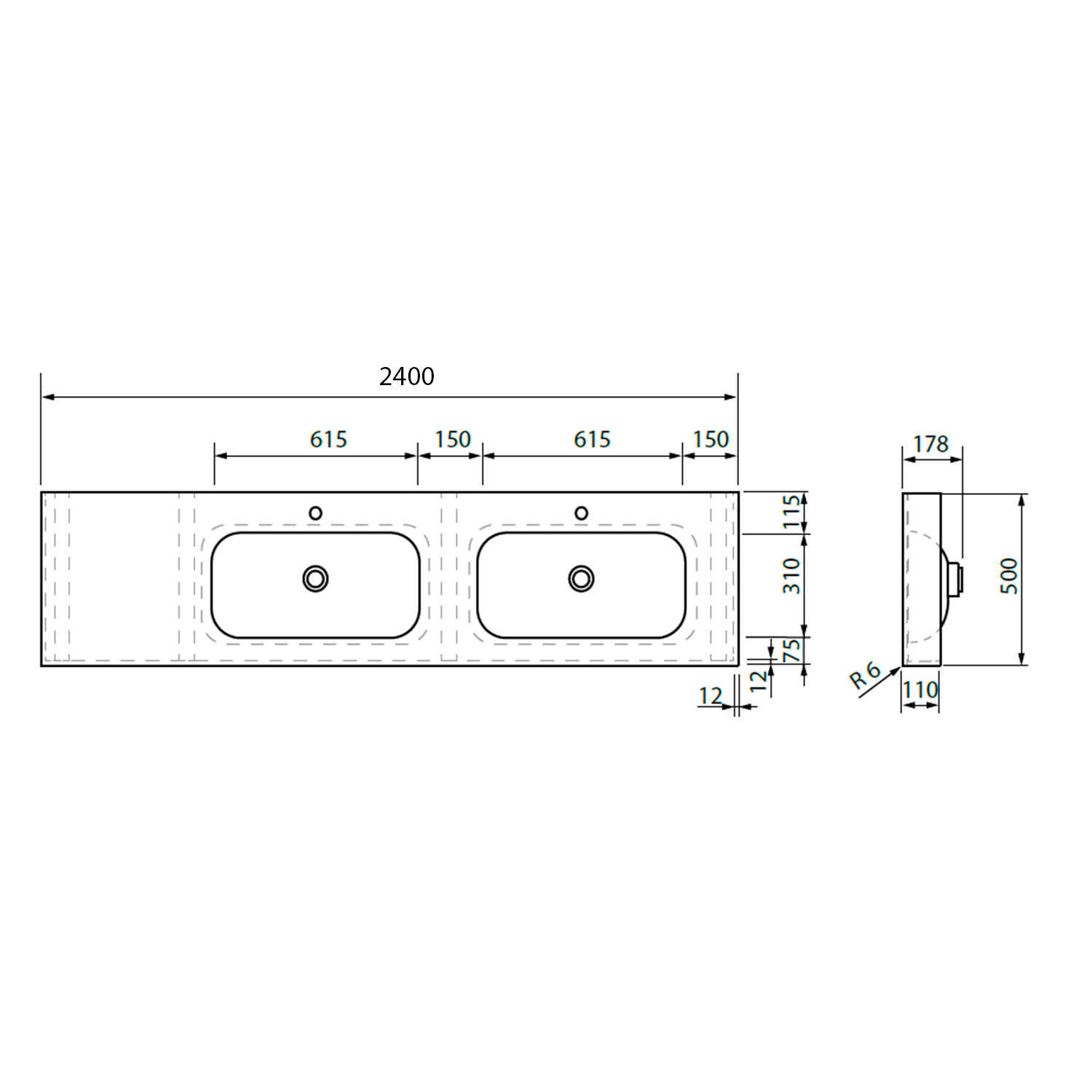 Zátka umyvadlové výpusti je vyrobena ze stejného materiálu jako umyvadlo. V otevřené poloze je zátka v jedné rovině se dnem umyvadla. Umyvadlo lze umístit i do vyzděné niky. Doporučujeme instalovat každých 70 cm podpěrnou konzoli.