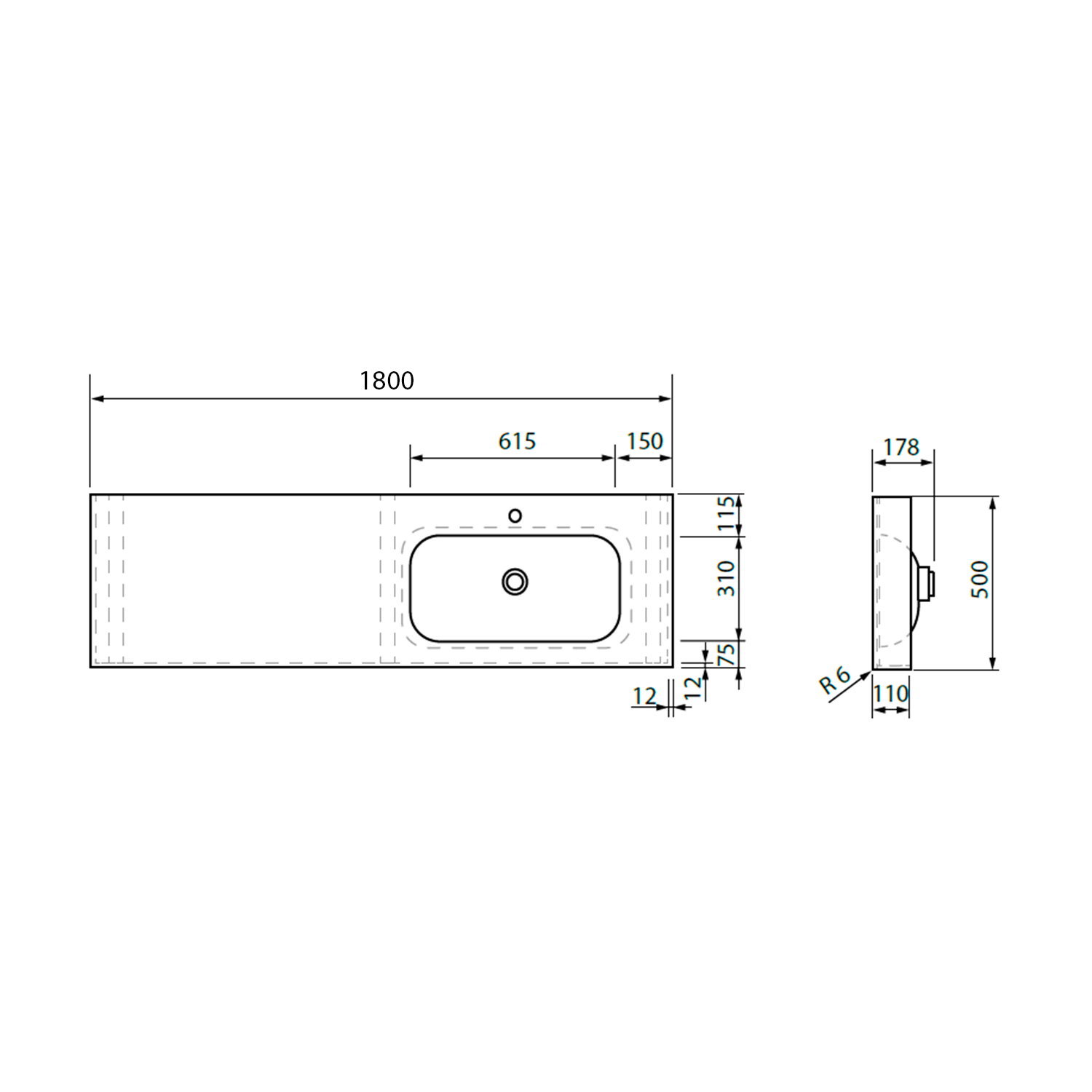 EMICO umyvadlo, Rockstone, 180x50cm, límec L, pravé, bílá mat
