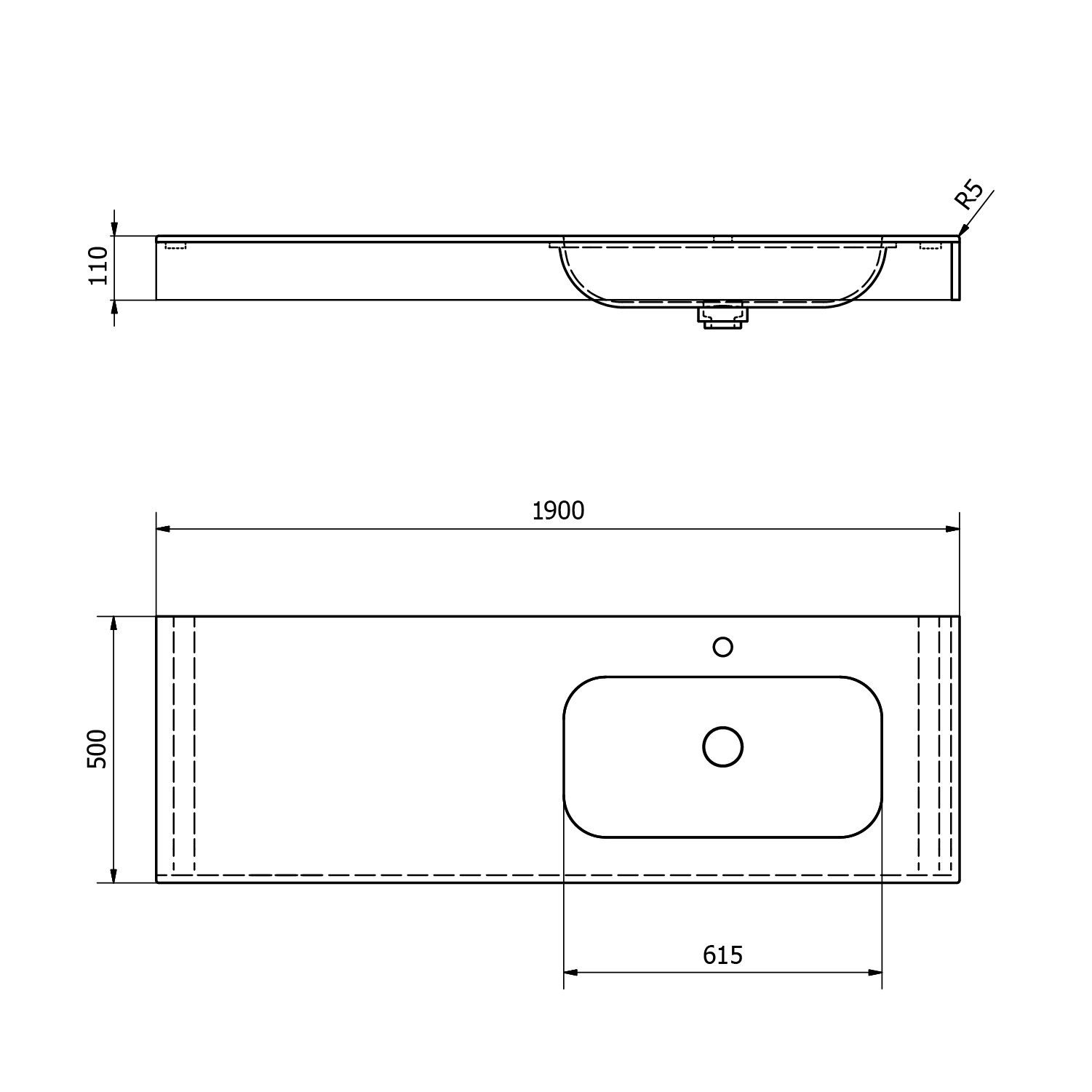 Zátka umyvadlové výpusti je vyrobena ze stejného materiálu jako umyvadlo. V otevřené poloze je zátka v jedné rovině se dnem umyvadla. Umyvadlo lze umístit i do vyzděné niky. Doporučujeme instalovat každých 70 cm podpěrnou konzoli.
