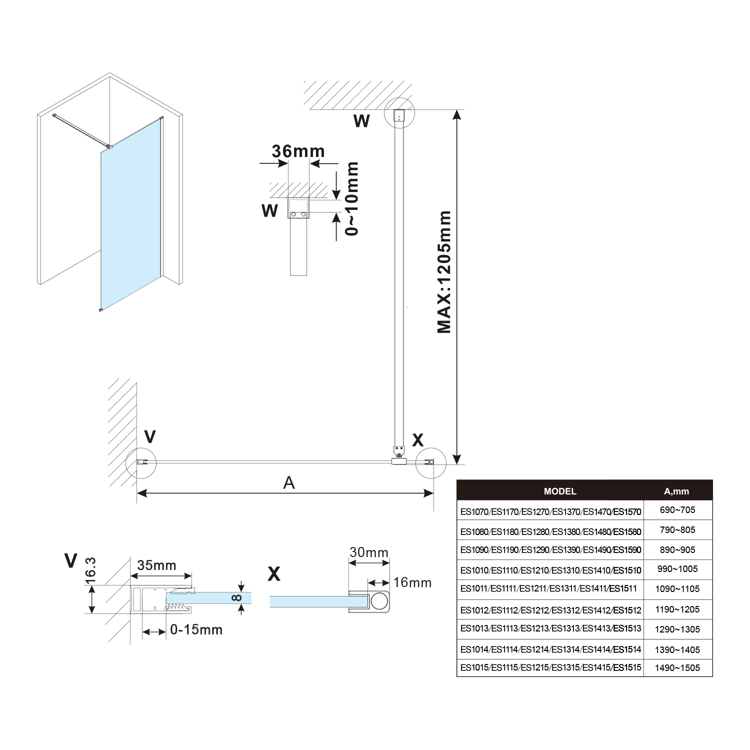 - Stěnové profily s tolerancí 15 mm usnadňují stabilní montáž zástěn, instalace je možná na dlažbu nebo sprchovou vaničku