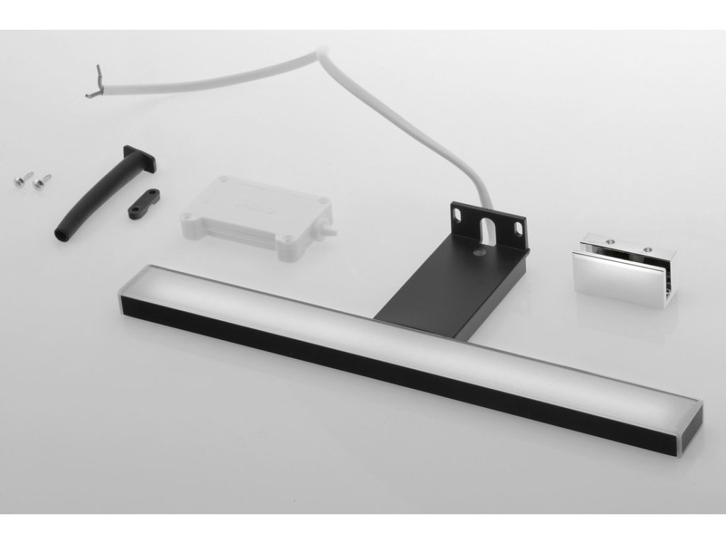 Součástí balení je univerzální držák v chromu, pomocí kterého lze instalovat svítidlo na galerku nebo přímo na zrcadlo (max. tloušťka zrcadla je 6 mm).