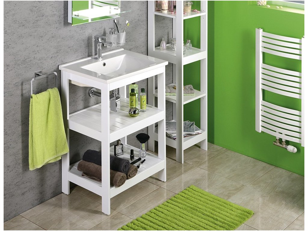 Umyvadlové skříňky doplňují koupelnové regály ve třech velikostech. Vysoký a nízký se čtvercovou základnou a nízký s obdélníkovou základnou. Regály lze postavit nejen v koupelně, ale i v jiných místnostech.