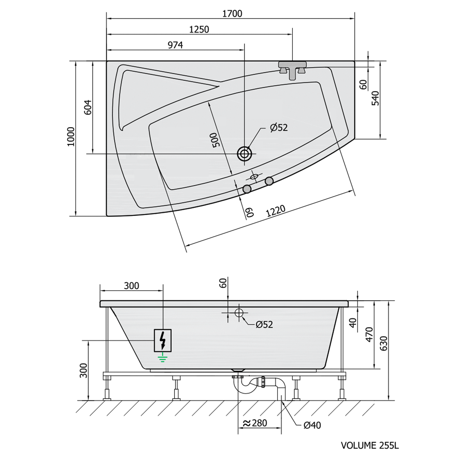EVIA L hydromasážní vana, 170x100x47cm, Active Hydro, chrom