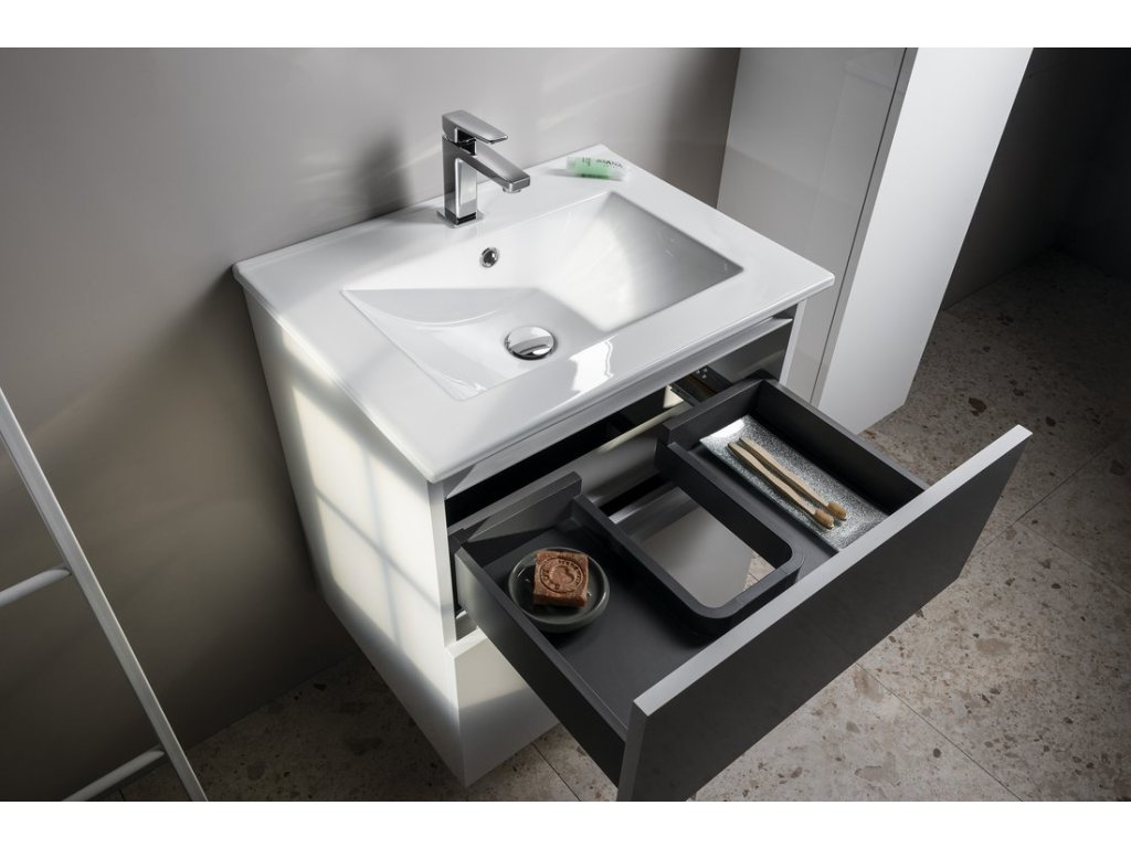 Zásuvky jsou vybaveny výsuvy s pomalým dojezdem a automatickým dovřením. Úložný prostor lze rozšířit přidáním doplňkových skříněk ESPACE. Nábytek je dodáván ve smontovaném stavu, připravený k okamžité instalaci.