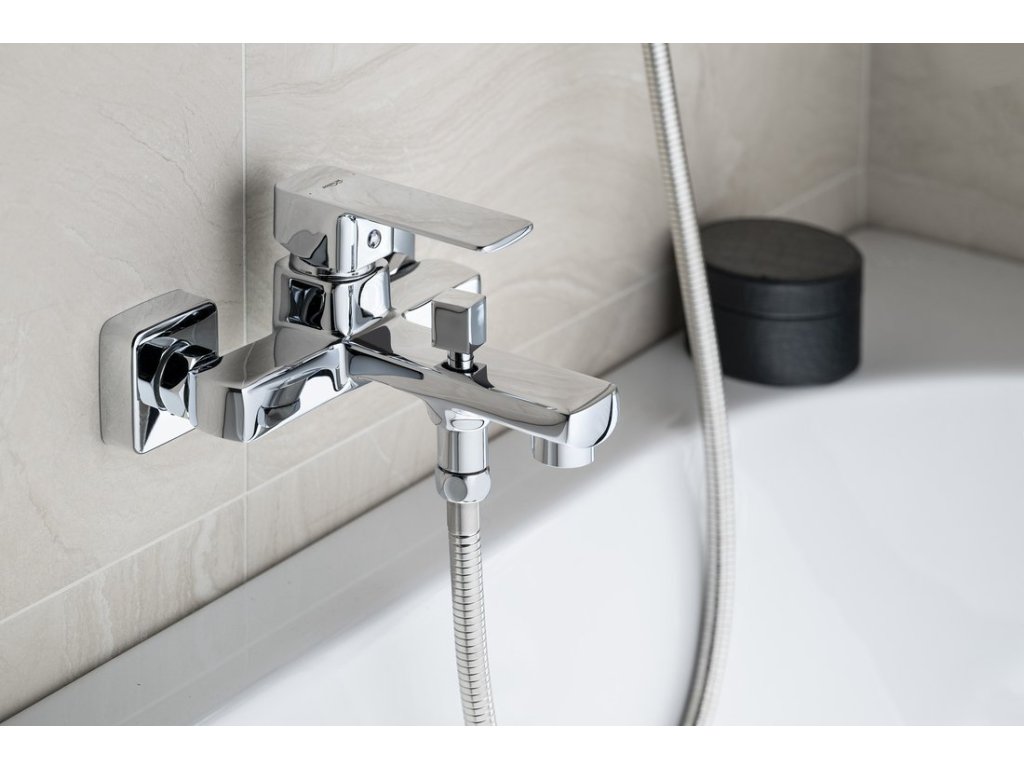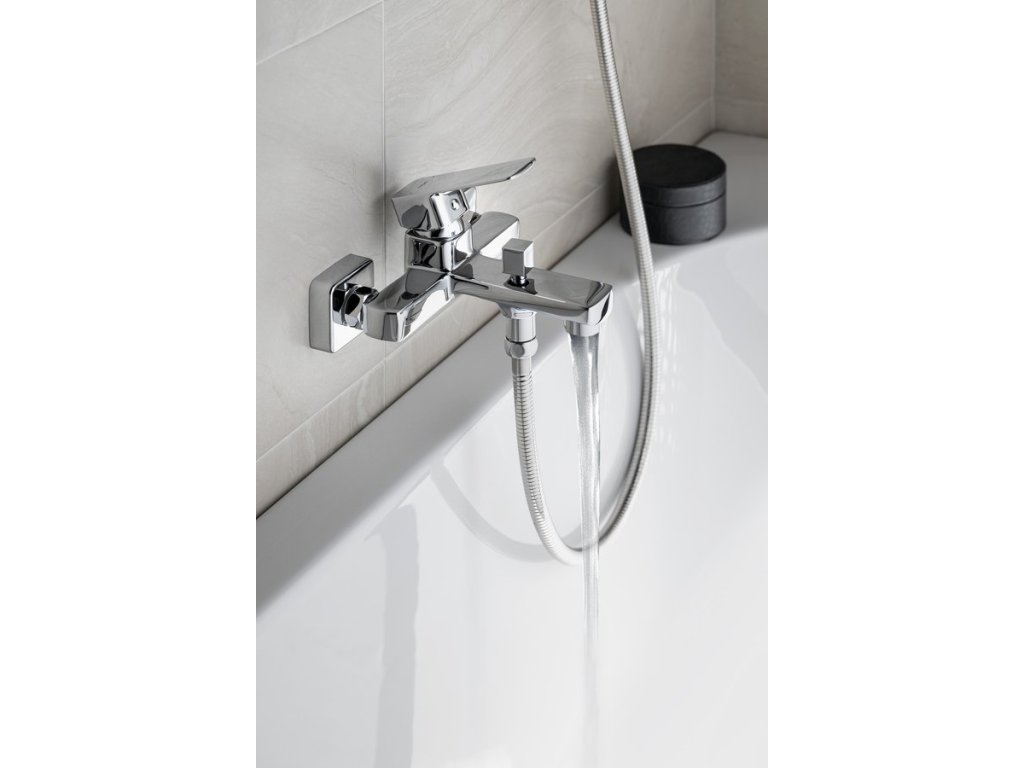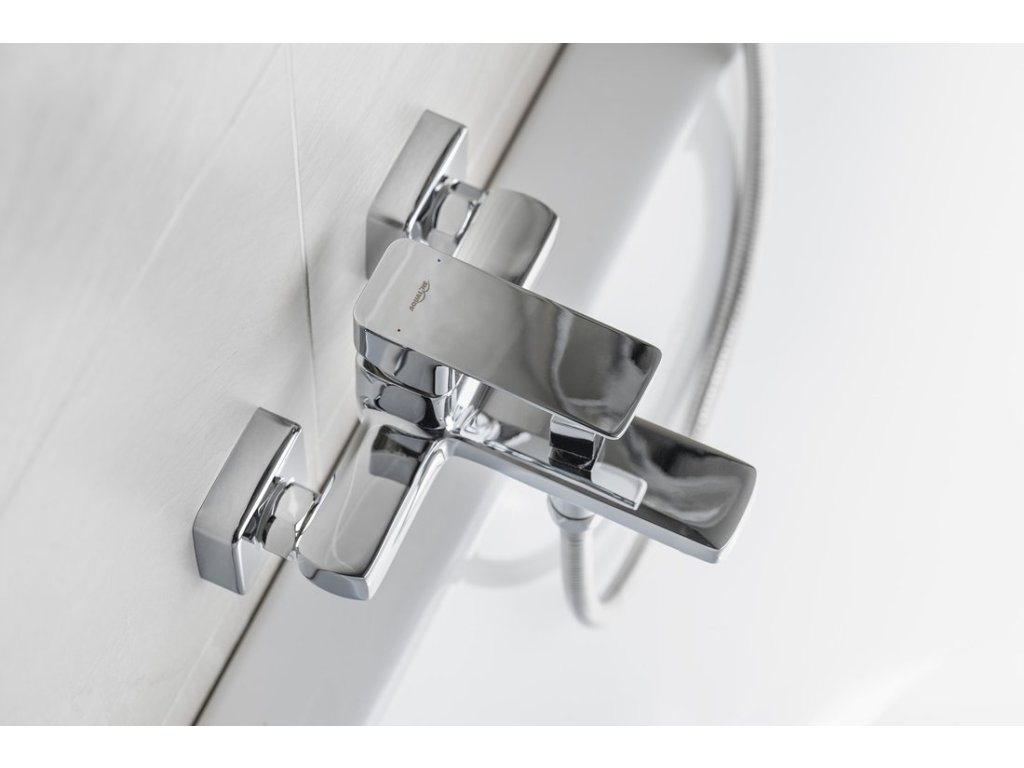 Série pákových baterií FACTOR je charakteristická kombinací hranatých tvarů a zaoblených rohů.