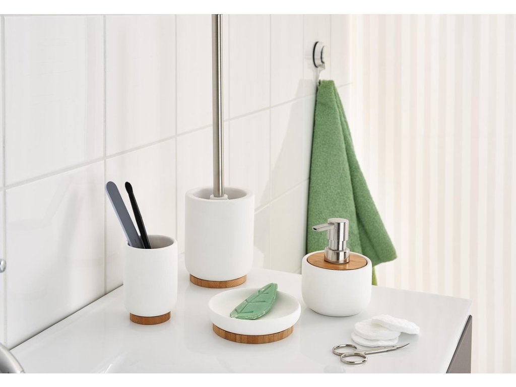 Série doplňků FANCY na první pohled zaujme zdařilým provedením. Příjemně oblé tvary a výběr ze tří barev (bílá, černá a tmavě zelená) je opravdovým lákadlem pro každou koupelnu. Stylové doplňky jsou vyrobeny z keramiky, která je potažena matným soft-touch povrchem, a bambusu.
