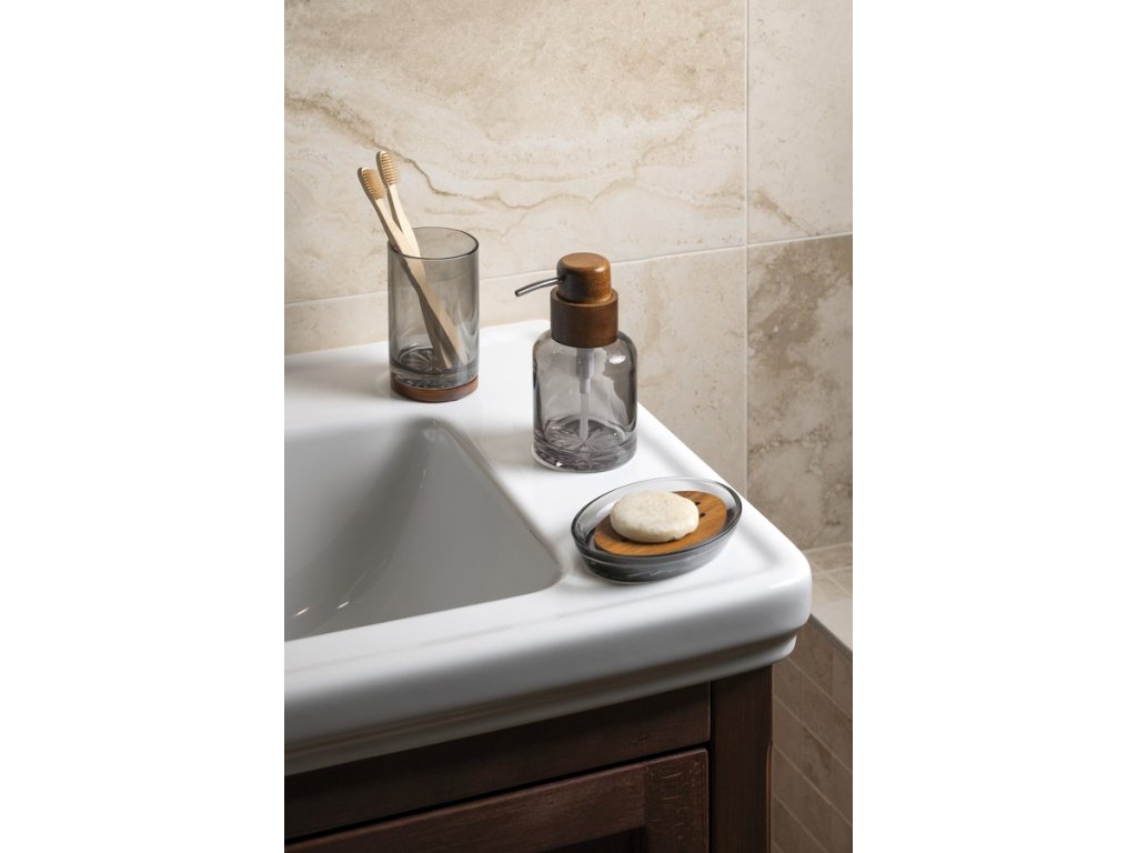 Doplňky z kolekce FIGO se vyznačují kombinací kouřového skla a dřeva, jejichž sladěný design tvoří harmonický celek. Sada obsahuje mýdlenku, sklenku na zubní kartáčky a dávkovač mýdla.