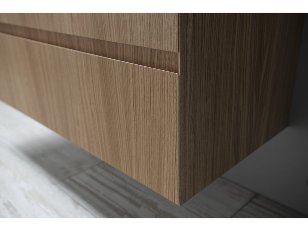 Dokonale decentní série koupelnového nábytku FILENA nabízí skříňky z dubové dýhy v přírodním provedení dekoru dřeva ošetřeném transparentním lakem, v bílém matném lakování a v černě matném lakovaném drážkovaném designu. Ostré zkosené hrany pod úhlem 45° čel zásuvek a dvířek vytváří tenkou linii, která je pro sérii charakteristická. Čistý design není rušen úchytkou, pohodlné otevírání umožňuje zkosená hrana a otvor mezi zásuvkami.