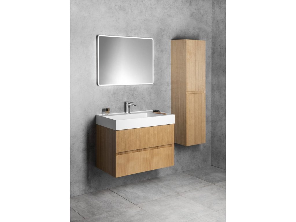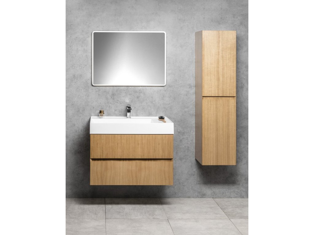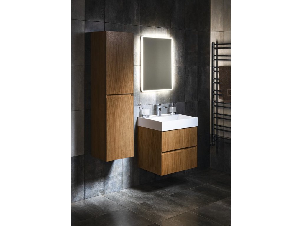 Dokonale decentní série koupelnového nábytku FILENA nabízí skříňky z dubové dýhy v přírodním provedení dekoru dřeva ošetřeném transparentním lakem, v bílém matném lakování a v černě matném lakovaném drážkovaném designu. Ostré zkosené hrany pod úhlem 45° čel zásuvek a dvířek vytváří tenkou linii, která je pro sérii charakteristická. Čistý design není rušen úchytkou, pohodlné otevírání umožňuje zkosená hrana a otvor mezi zásuvkami.