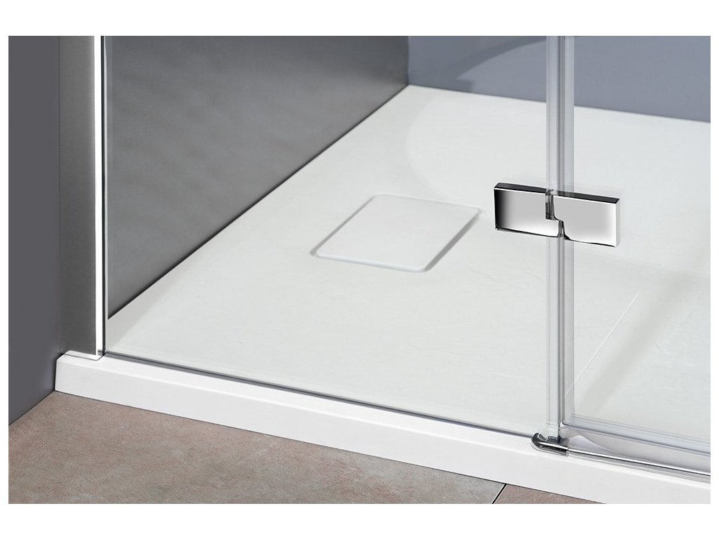 Pochromované madlo | Mosazné pochromované panty se zvedací funkcí... | ... z vnitřní strany zapuštěné do skla | Stabilitu zástěn zajišťuje rohová vzpěra |