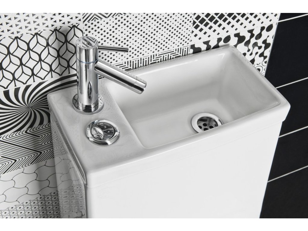 WC HYGIE je ideální variantou do malých místností, kde je potřeba ušetřit prostor. Umístěním umývátka na nádržce dochází k šetření vody, která při mytí rukou protéká do nádržky, až do jejího úplného napuštění. V případě plné nádržky odtéká voda do mísy.