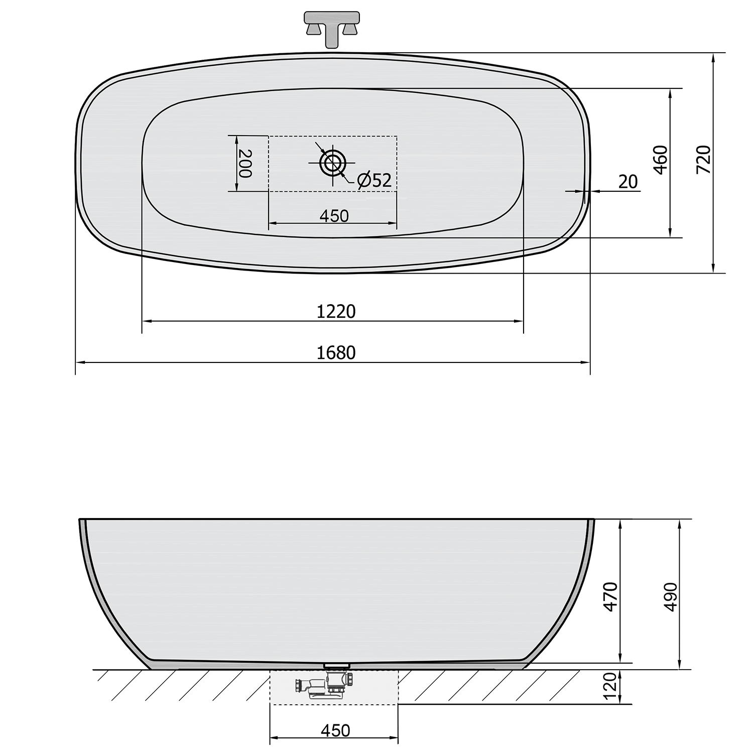 - Vana je bez přepadového otvoru. Sifon je nutno zapustit do podlahy.