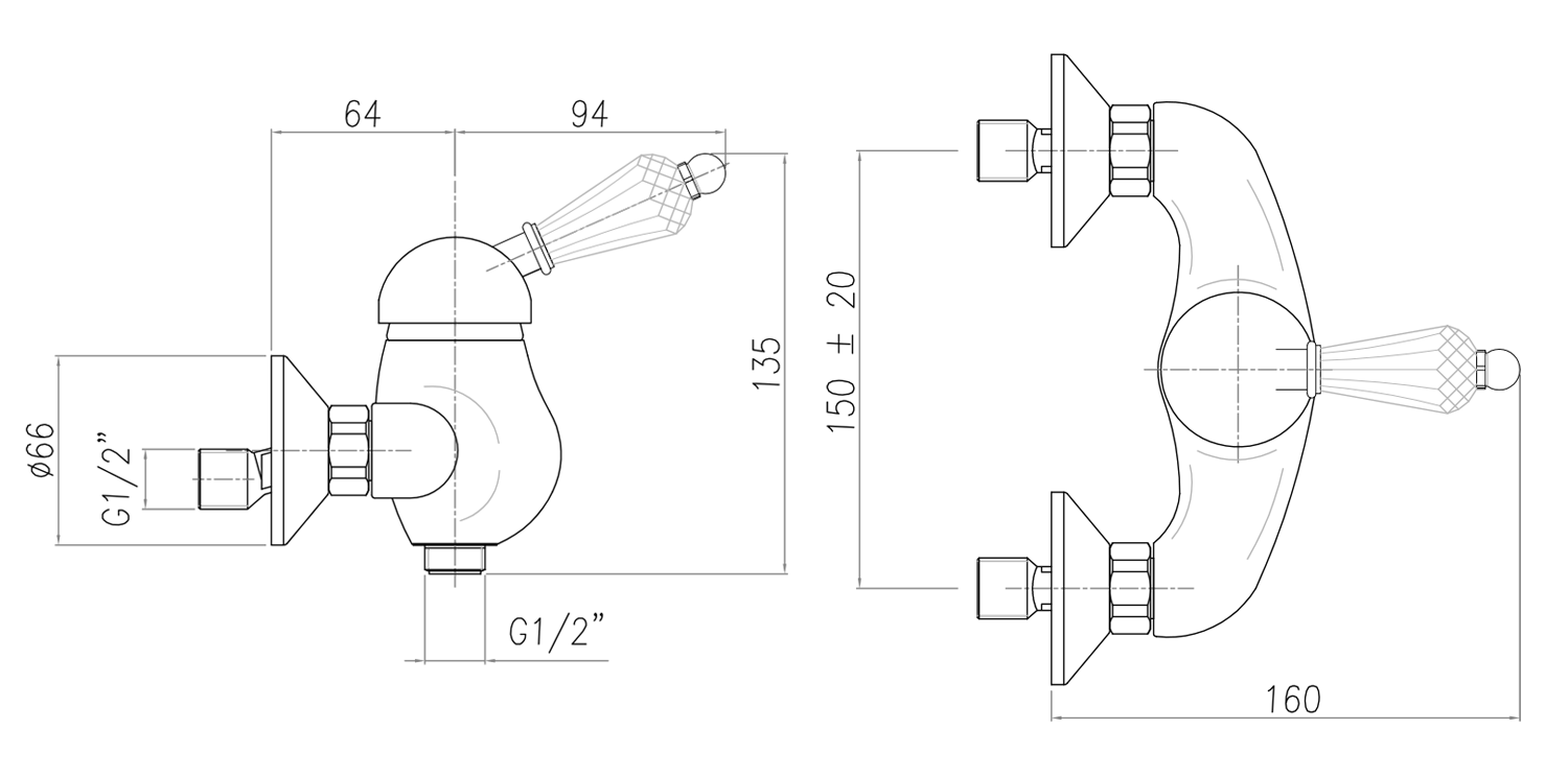 KIRKÉ CRYSTAL nástěnná sprchová baterie, páčka krystal, chrom