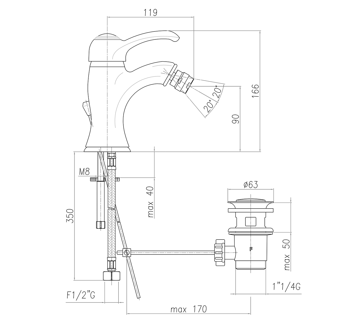KIRKÉ stojánková bidetová baterie s výpustí, chrom