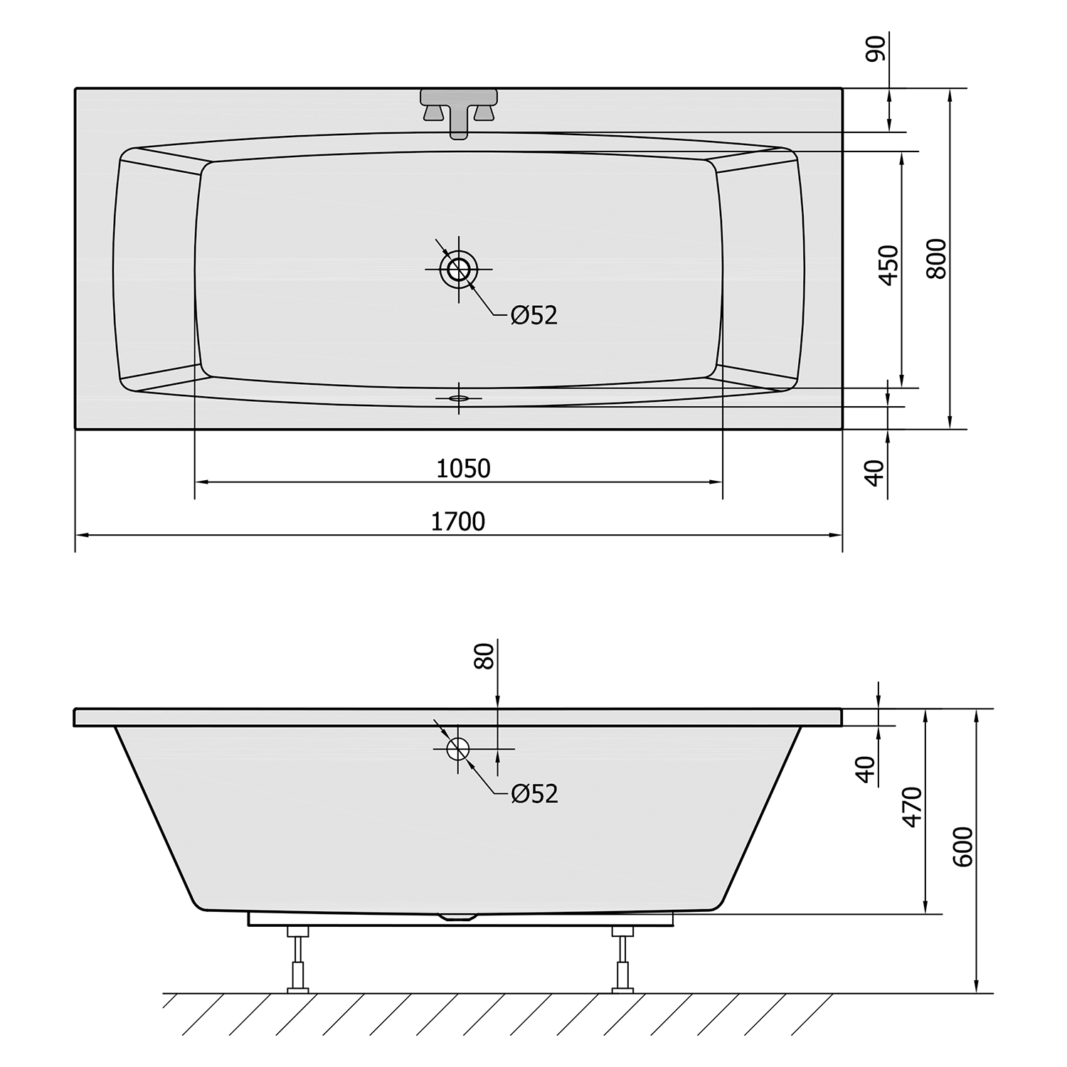 KVADRA obdélníková vana s konstrukcí 170x80x47cm, bílá