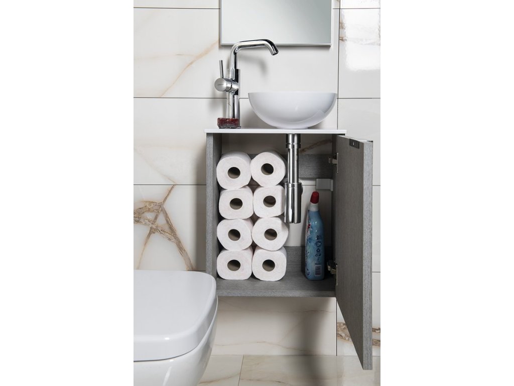 Malé rozměry koupelnového nábytku LATUS umožňují instalaci především do stísněných prostor, obzvláště na toalety. Skříňka se přímo nabízí k uskladnění čistících a hygienických prostředků nebo toaletního papíru. Umyvadlo z litého mramoru nebo keramiky vytváří se skříňkou kompaktní celek. V nabídce je jak několik tvarů umyvadel, tak barevných dekorů skříněk pro větší kompatibilitu.