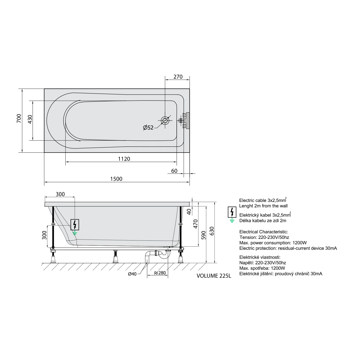 LISA hydromasážní vana, 150x70x47cm, Attraction Hydro, chrom