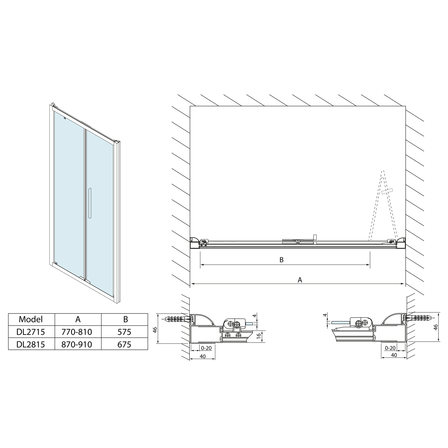 - Snadnou montáž umožňuje výsuvný stěnový profil v rozmezí 0-20 mm